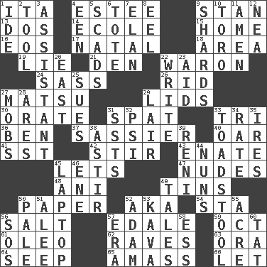 ACROSS 1. Call ___ day 4. First name in cosmetics 9. Comedian Laurel of Laurel & Hardy 13. Two (Sp.) 14. Learning spot: Fr. 15. Dwelling 16. Greek goddess of the dawn 17. Brizilian seaport 18. Type of rug 19. Untruth 21. Lair 22. Make _____ (do battle with) 24. Backtalk 26. To free from 27. Taiwanese island in East China Sea 29. Flaplike coverings 30. Declaim 31. Petty quarrel 33. Three (prefix) 36. Benjamin's nick name 37. More impudent 40. Boat paddle 41. Fast jet (abbr.) 42. Commotion 43. Maternal 45. Allows 47. Unclothed pictures 48. Cuckoo 49. Metal containers 50. Some stationery 52. Alias (abbr.) 54. R.R. building 56. Table seasoning 57. Peak District village in England 59. Sep. follower 61. Butter sub 62. All-night dance parties 63. Mouth or opening 64. Ooze 65. Collect or gather 66. Allow DOWN 1. Binary compound 2. Utensil 3. Helper 4. Car or cant ending 5. Large numbers or amounts 6. Carryall 7. Style 8. Snakelike fish 9. Broken pieces 10. "Corrida" creature 11. So be it 12. Teachers' org. 20. Compass direction 22. Compose 23. Assist 25. Takes to court 27. Crowds into 28. Ancient Greek god of war 29. Den 31. Fast planes 32. 23rd letter of the Greek alphabet 33. Inedible or poisonous agaric 34. Assign a rank or rating to 35. Angers 38. Having gotten out of bed 39. Painter Guido (1575-1642) 44. Religious women 45. Portable computer 46. Compass dir. 49. Lies 50. Light colored 51. Toward shelter 52. First man 53. Polynesian shrub of the pepper family 55. Land measure 56. Mayday 57. Period 58. Curvy letter 60. Make lace