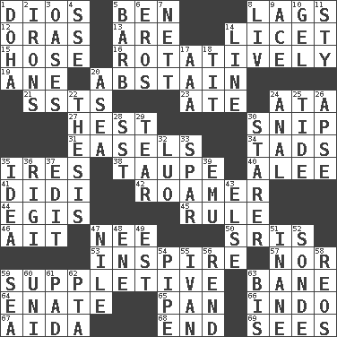 ACROSS 1. "Vaya con ____" 5. Benjamin's nick name 8. Straggles 12. Mouths or openings 13. "We ___ not amused" (Victoria) 14. It is permitted: Lat. 15. Flexible conduit 16. Happening in regular succession 19. A saturated hydrocarbon 20. Choose not to consume 21. Fast planes 23. Had dinner 24. _ moment's notice (2 wds.) 27. Command 30. Clip 31. Artist's stands 34. Bits 35. Angers 38. Grayish beige 40. Toward shelter 41. "You Light Up My Life" star Conn 42. Wanderer 44. The front part of a cuirass 45. Governing power 46. Small island 47. Born 50. Indian titles of respect 53. Motivate 57. Or not 59. Supplementary 63. Object of repulsion 64. Related on the mother's side 65. Baking dish 66. _ china 67. Opera by Verdi 68. Conclude 69. Perceives with the eye DOWN 1. Capital of the state of Qatar 2. Removes the wrinkles 3. Fertile tracts in a desert 4. Compass dir. 5. Sharp remark 6. Greek god of love 7. Remaining after all deductions 8. 54 in ancient Rome 9. Adept person 10. Set 11. Filthy place 14. Actor's bit 17. American Automobile Association (abbr.) 18. Teat (slang) 20. Toward the sea 22. College paper 24. Of or related to the anus 25. Event that recurs at intervals 26. Domed church section 28. Fast jet (abbr.) 29. Separate forcefully 30. A viewer who gazes fixedly 32. Nilotic language 33. Practice fight 35. The content of cognition 36. Swiss mountan, "Queen of the Mountains" 37. Prepare for publication 39. Australian flightless bird 43. Otherwise 47. The longest river in the world 48. Compass dir. 49. Eastern Standard Time (abbr.) 51. Silly 52. Something which is sent 54. Corncob 55. "Terrible" tsar 56. Tear apart 58. Vintage cars 59. Ocean 60. University (slang) 61. Groovy apt. 62. Parent Teacher Association (abbr.) 63. Twice
