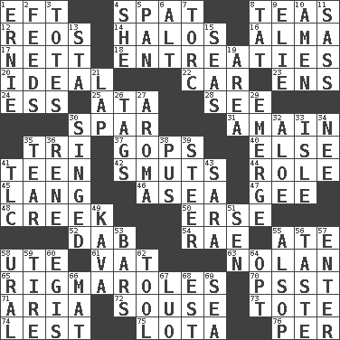 ACROSS 1. Bank Draft (abbr.) 4. Argument over a trivial matter 8. Afternoon social gatherings 12. Vintage cars 14. Saint headwear 16. _ mater 17. Remaining after all deductions 18. Pleas 20. Perfect 22. 4-wheeled motor vehicle 23. Followers of ems 24. Double-curved letter 25. "One Day ___ Time" 28. Perceive with the eye 30. Coast Guard woman 31. With great haste 35. Three (prefix) 37. Republicans 40. Otherwise 41. Adolescent 42. Particles of soot 44. Hero or heavy, e.g. 45. Long (Scottish) 46. Toward the sea 47. Turn to the right 48. Small stream 50. Celtic language 52. Apply (a substance) by light strokes 54. Actress Charlotte 55. Had dinner 58. Shoshoni 61. Large container 63. Pitcher Ryan 65. Frustrating wastes of time 70. Inconspicuous attention getter 71. Roberta Peters solo 72. Boozer 73. Carry 74. For fear that 75. Globular water bottle used in Asia 76. For each DOWN 1. Bert's buddy 2. Gives food to 3. Lugs 4. A female animal or person 5. Baking dish 6. Keyboard modifier key 7. Torque (variant) 8. Make lace 9. Writer Wiesel 10. So be it 11. Backtalk 13. R.R. building 15. Oceans 19. Type of rug 21. Infant locale 26. Labels 27. Odor 29. Develop 30. Burned superficially 32. Medicinal plant 33. Capri or Wight 34. Born 35. Pull apart 36. French philosopher Descartes 38. Festering 39. Guide 41. Affectionate concern, for short 43. "Two Mules for Sister ____" 49. Polynesian shrub of the pepper family 51. Elected rep. 53. Long, evenly shaped pieces 55. Columnist Joseph or Stewart 56. Clothes sense 57. Keyboard key 58. Mountain range 59. Hoop that covers a wheel 60. Armor plate that protects the chest 62. Implement 64. Choose 66. Floor protector 67. Nilotic language 68. Eastern Standard Time (abbr.) 69. Ocean