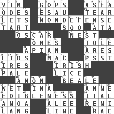 ACROSS 1. Zeal 4. Republicans 8. Toward the sea 12. Lyric poems 14. Son of Isaac 15. Rend 16. Allows 17. Unrelated to defense, as in spending 20. Small pie 21. "Barney Miller" actor Jack 22. "One Day ___ Time" 23. Motion picture award 27. A home for chicks 29. Singles 31. Lacquered or enameled metalware 34. Bee-related 35. Ancient Greek god of war 36. Hats (slang) 39. Apple computer (short form) 41. Inconspicuous attention getter 42. Angers 43. From or relating to Ireland 46. Light colored 47. Louse (plural) 48. Soon (poet.) 51. Calif. Air Force Base 54. Dripping 56. _ tizzy (2 wds.) 58. Singer Murray 61. The property of being fit to eat 66. Slanted text style (abbr.) 67. Small Philippine buffalo 68. Toward shelter 69. Painter Guido (1575-1642) 70. Long (Scottish) 71. Actor's bit 72. Actress Charlotte DOWN 1. Electrical Unit 2. The content of cognition 3. Paris' subway 4. Commissioned mil. rank 5. Bear (Spanish) 6. Baking dish 7. Soap bubbles 8. Had dinner 9. Elected representatives 10. Compass direction 11. Type of rug 13. Fast planes 18. A really long time 19. Enemy 24. Police officer (slang) 25. Cuckoo 26. 480, 500 or 516 sheets of paper 28. Staphylococcus 30. Slow-paced one 32. French article 33. Eastern Standard Time (abbr.) 34. NE Netherlands city 36. Mouth edge 37. Retirement account (abbr.) 38. Conveyance 40. Baby bed with high sides 44. Frozen water 45. Ocean 49. Petroleum 50. Compass dir. 52. Den 53. Keyboard key 54. Welt 55. Pulitzer Prize-winning author Ferber 57. Of or related to the anus 59. Nanny 60. Writer Wiesel 62. Paper or plastic container 63. Biblical high priest 64. Elected rep. 65. Perceive with the eye