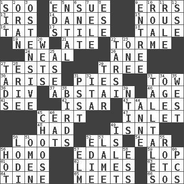 ACROSS 1. "Barney Miller" actor Jack 4. Follow as a consequence or result 9. Blunders 13. Big collection agency 14. Natives or inhabitants of Denmark 15. Horse sense 16. Make lace 17. Vertical member of a panel or frame 18. Lie 19. ___ Haven, CT 21. Had dinner 22. Singer Mel 24. Be tempered by heat 26. One (Scot) 27. Trials 29. Family _ (genealogy) 30. Originate 31. Sliced desserts 33. Pull behind 36. HTML Container Element 37. Refrain by choice 40. Ripen 41. Perceive with the eye 42. Austrian river, tributary to the Danube 43. Stories 45. Foregone conclusion 47. An arm off of a larger body of water 48. Possessed 49. Is not 50. Plunders 52. Raised railways 54. Hearing organ 56. Same (prefix) 57. Peak District village in England 59. Trim (branches) 61. Lyric poems 62. Citrus fruits 63. And so on (abbr.) 64. Prong on a fork 65. Confronts 66. Distress signal DOWN 1. Be seated 2. NW Algerian seaport 3. Clearly or manifestly demonstrative 4. Begley and Asner 5. Relating to or accompanying birth 6. In a ____ (agitated or irritated) 7. Ubangi River tributary 8. Compass dir. 9. Main course 10. Wander aimlessly 11. Court order 12. Compass dir. 20. Moistens 22. Tarsus (plural) 23. Single 25. Toward the sea 27. Small amounts or degrees 28. 4th largest of the Great Lakes 29. Lacerate 31. Inconspicuous attention getter 32. Call ___ day 33. Baron Munchausen's specialties 34. Double curve, resembling the letter S 35. Compass direction 38. Avian creatures 39. Nuclear Threat Initiatives 44. Singer Murray 45. Elect 46. Erode 49. Small island 50. Farming town in central California 51. Presage 52. Singer Brickell 53. Unable to walk 55. Printing process, for short 56. Being at a high temperature 57. Shade tree 58. Curvy letter 60. Personal Computers (abbr.)