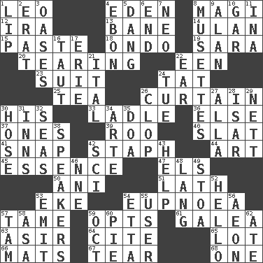 ACROSS 1. Lion 4. Paradise 8. Wise men 12. Retirement account (abbr.) 13. Object of repulsion 14. ____ Bator, Mongolia 15. Thick mixture 18. Southwest Nigerian state 19. "Two Mules for Sister ____" 20. Rending 22. Car or cant ending 23. Costume for a special activity 24. Make lace 25. Afternoon social gathering 26. Window treatment 30. Part of HMS, perhaps 33. Dipping utensil 36. Otherwise 37. Washington bills 39. Friend of Pooh 40. Narrow board 41. Fastener 42. Staphylococcus 44. Nonscientific branch of learning 45. Center 47. Raised railways 50. Black tropical American cuckoo 51. Thin strip of wood or metal 53. Make supply last 54. Normal relaxed breathing 57. Not wild 59. Elects 61. An organ shaped like a helmet 63. SW Saudi Arabia district 64. Quote 65. Car dealer's back yard 66. Floor coverings 67. Pull into pieces 68. Single DOWN 1. Mouth edge 2. Part of Q.E.F. 3. Fertile tracts in a desert 4. Inky black, to poets 5. Mild oath, euphamism for damn 6. Conclude 7. Modern: prefix 8. French bagpipes 9. ____ Jay Lerner 10. Slender fish 11. _ tizzy (2 wds.) 16. Strained 17. One of the Great Lakes 21. Slanted text style (abbr.) 22. Hearing organ 24. Third day of the wk. 26. Hoof sound 27. Silent film actress Nazimova 28. Austrian river, tributary to the Danube 29. Remaining after all deductions 30. Stockings 31. Restaurants 32. Oceans 34. Johnson of "Laugh-In" 35. ___ good deed 38. Orators 42. _-fi 43. Aid 46. Compass dir. 48. Austrian-born American filmmaker Fritz 49. Portico 52. Phone greeting 53. Send forth 54. Singer James 55. One who uses or employs something 56. Age 57. Scottish cap 58. White ___ sheet 59. Sep. follower 60. Sliced dessert 62. Had dinner