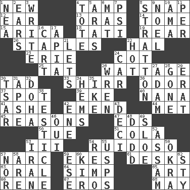 ACROSS 1. ___ Haven, CT 4. Pack (down) 8. Fastener 12. Hearing organ 13. Mouths or openings 14. Heavy book 15. N. Chile seaport 18. Jacques of French films 19. Hitchcock's "____ Window" 20. Paper fasteners 22. Actor Linden 23. 4th largest of the Great Lakes 24. Small bed 25. Make lace 26. Electrical Measurement 30. Small amount or degree 33. Bake eggs in their shells 36. Scent 37. Specific locale 39. Make supply last 40. Grandmother 41. American tennis player Robert 42. Make improvements or corrections to 44. Was introduced to 45. Thinks logically 47. Begley and Asner 50. Third day of the wk. 51. Root beer relative 53. One more than two 54. Boisterous (Brazilian Portuguese) 57. Drug cop 59. Makes supply last 61. Writing tables 63. Relating to the mouth 64. Simple or foolish person 65. Nonscientific branch of learning 66. French philosopher Descartes 67. Greek god of love 68. Can I? DOWN 1. Teachers' org. 2. Hearing organs 3. Compose 4. Lug 5. Ancient river in northeast Turkey 6. Floor protector 7. 23rd letter of the Greek alphabet 8. Ski resort town in Vermont 9. Christmas carol 10. Nursemaid (var.) 11. For each 16. Haul 17. Capital of Western Samoa 21. Allows 22. Being at a high temperature 24. 4-wheeled motor vehicle 26. Songbird 27. First man 28. Went 29. Part of Q.E.F. 30. Russian ruler of old 31. Domed church section 32. Capital of the state of Qatar 34. Folds over and sews together 35. Eisenhower's nickname 38. One of the two male reproductive glands 42. Compass dir. 43. Tenth: prefix 46. Fr. "Yes" 48. Texas town _ City 49. A type of plum 52. Indian state 53. SW Asia republic 54. San ____ (Riviera town) 55. United States Postal Service (abbr.) 56. Gumbo ingredient 57. Or not 58. "We ___ not amused" (Victoria) 59. Compass dir. 60. Apertif with cassis 62. Filthy place