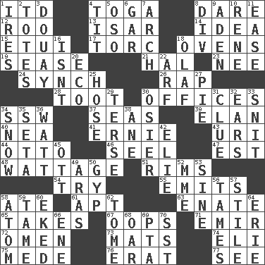 ACROSS 1. It would 4. Ancient Roman robe 8. Have the gumption 12. Friend of Pooh 13. Austrian river, tributary to the Danube 14. It may be bright or harebrained 15. Needle holder 17. Torque (variant) 18. Baking chambers 19. Gospel singer Marvin 21. Actor Linden 23. Born 24. Synchronize (abbr.) 26. Strike 28. A blast of a horn 30. Positions of authority 34. Compass dir. 37. Oceans 39. Flair 40. Teachers' org. 41. Bert's buddy 43. RI univ. 44. "Beetle Bailey" pooch 46. Sew up the eyelids of hawks and falcons 47. Eastern Standard Time (abbr.) 48. Electrical Measurement 51. Basketball hoops 54. Attempt to accomplish something 55. Gives off 58. Had dinner 61. Fitting 63. Related on the mother's side 65. Receives possession of 67. I made a mistake 71. Arab leader 72. Sign of things to come 73. Floor protectors 74. Biblical high priest 75. Ancient Persian 76. Part of Q.E.F. 77. Perceive with the eye DOWN 1. Angers 2. Hauls 3. A city in N France, SE of Calais 4. Teat (slang) 5. Bear (Spanish) 6. Slender fish 7. Bowlike part 8. HTML Container Element 9. Arabian gulf 10. French philosopher Descartes 11. Comfort 16. Is not 18. Norwegian king 20. Environmental prefix 22. Sandy's bark 25. Stockings 27. Sliced dessert 29. Laconic 30. Flexible twig of a willow tree 31. A slight indication 32. Hearing organs 33. In a ____ (agitated or irritated) 34. Overwhelm 35. Stalk of a moss capsule 36. Electrical Unit 38. One (Scot) 42. Writer Wiesel 45. Baseball player Mel 49. Ancient river in northeast Turkey 50. Con 52. Madame (abbr.) 53. Trig term 56. Corrects by punishment or discipline 57. Vertical member of a panel or frame 58. Tiny particle 59. Not wild 60. Made supply last 62. Heavy book 64. 4th largest of the Great Lakes 66. Compass dir. 68. Rowing implement 69. Parent Teacher Association (abbr.) 70. Fast jet (abbr.)