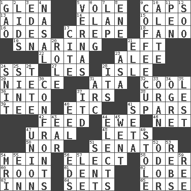 ACROSS 1. Small, secluded valley 5. Grand slam 9. Balmoral and tarboosh 13. Opera by Verdi 14. Liveliness 15. Butter sub 16. Lyric poems 17. Streamer paper 18. Papal veil 19. Catching in a trap 21. Newt 22. Globular water bottle used in Asia 23. Toward shelter 24. Fast jet (abbr.) 27. French article 28. Capri or Wight 29. Sibling's daughter 31. "One Day ___ Time" 32. Calm and collected 36. To the inside or interior of 37. Big collection agency 38. Goad 39. Adolescent 40. And so on (abbr.) 41. Practice fights 42. Nourish 44. She-sheep 46. Fish or hair follower 47. Mountain range 48. Allows 50. Or not 51. Elected representative 54. Count _ (2 wds.) 56. Voters do this 58. Baltic tributary 60. Carrot, for example 61. Gouge 62. Ear part 63. Lodging establishments 64. Puts into a specified state 65. Celtic language DOWN 1. E Mali city 2. Flaplike coverings 3. Locale of original sin 4. Relating to the nose 5. Actresses Bloom and Felton 6. Cassini of fashion 7. Infant locale 8. Compass dir. 9. Java holder (2 wds.) 10. Having winglike extensions 11. Animal enclosure 12. "Barney Miller" actor Jack 17. Quote 20. Hero or heavy, e.g. 21. Pipe bend 23. White ___ sheet 24. In a ____ (agitated or irritated) 25. Trig term 26. False hair 28. It is 30. Meets 31. Curve 33. Northwest Algerian city 34. Legendary monster 35. For fear that 37. It would 40. Snakelike fish 41. Bristle 43. Hearing organ 44. Opts 45. Gone 47. The state of being joined or united 49. Took without asking 51. Emitted 52. Scent 53. Confederate soldiers (slang) 54. Medical imaging device (abbr.) 55. Period of immesurable duration 56. Begley and Asner 57. Area sheltered from the wind 59. To riddle