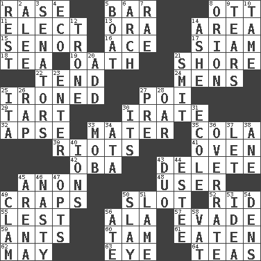 ACROSS 1. To erase 5. Long, evenly shaped piece 8. Baseball player Mel 11. Opt 13. Mouth or opening 14. Type of rug 15. Sir (Sp.) 16. Adept person 17. Thailand, formerly 18. Beverage made from leaves 19. Pledge 21. Dinah or Pauly 22. Look after 24. Not women's 25. Pressed 27. Luau course 29. Small pie 30. Feeling or showing extreme anger 32. Domed church section 33. Mother 35. Root beer relative 39. Disturbances 41. Baking chamber 42. Chief or king in Benin or Nigeria 43. Keyboard key 45. At once, immediately (arch.) 48. One who makes use of a thing 49. Dice game 50. Position in a hierarchy or organization 52. To free from 55. For fear that 56. In the manner of 57. Elude 59. Pismires 60. Scottish cap 61. Ingested 62. Fifth month 63. Sight organ 64. Beverages made from leaves DOWN 1. Respite 2. Toward shelter 3. Legislators 4. Environmental prefix 5. Water vessel 6. Bowlike part 7. Actress Charlotte 8. Greek mythologigal hunter 9. Separates forcefully 10. Not wild 12. Marketplace scale 14. American tennis player Robert 20. Find the sum of 21. Stricken, poetically 23. Keyboard key 25. Call ___ day 26. Reproach for some lapse or misdeed 27. Before (prefix) 28. Boat paddle 30. ___ a Wonderful Life 31. Learning spot: Fr. 33. Disorderly crowd 34. _ moment's notice (2 wds.) 36. Make much ado about nothing 37. Allow 38. One (Scot) 40. Charged atoms 43. Superhero pair 44. First name in cosmetics 45. Sports stadium 46. Smutty 47. Elects 49. Burrowing marine mollusk 50. Kill 51. Unable to walk 53. The content of cognition 54. Lairs 56. Had dinner 58. Large container