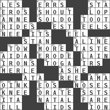 ACROSS 1. French article 4. Blunders 8. R.R. building 11. Greek god of love 13. Yell 15. Chop off 16. Singer Murray 17. Twentieth part of a lira 18. A blast of a horn 19. Amusement-park features 21. Eastern Standard Time (abbr.) 22. Snakelike fish 23. Born 24. ___ a Wonderful Life 27. Snakelike fish 29. Comedian Laurel of Laurel & Hardy 30. Place in a line 34. Pull behind 36. Greater amount 39. Clothes sense 40. Opera by Verdi 41. Eat (away) 43. (Had) reclined 44. Removes the wrinkles 46. Ancient Roman robe 47. Big collection agency 48. Haggard of country music 49. American tennis player Robert 51. "One Day ___ Time" 53. To sift 54. Housemaid (var.) 57. Pig sound 60. Greek goddess of the dawn 63. Olfactory organs 65. Leg joint 66. Speak pompously 69. Fast planes 70. Call ___ day 71. Relating to or accompanying birth 72. Conductor's collection 73. Pipe bend 74. Flaplike coverings 75. Electrically charged atom DOWN 1. Acquire or gain knowledge or skills 2. Bert's buddy 3. Something which is sent 4. Curvy letter 5. 17th letter of the Greek alphabet 6. Hero or heavy, e.g. 7. Beer foam 8. A type of plum 9. Utensil 10. Tenement units (abbr.) 12. Perceive with the eye 14. Lug 18. Copy Pinocchio 20. Be seated 25. Not wild 26. Derisive sound 28. Erode 29. Tchaikovsky ballet 31. Austrian river, tributary to the Danube 32. Nuclear Threat Initiatives 33. Car or cant ending 34. Become fatigued 35. Aroma 37. Friend of Pooh 38. _ Allan Poe 40. Direct toward a target or goal 42. Comfort 45. Arrange properly for use 50. Layer 52. Period of immesurable duration 54. Slender Brazilian palm 55. Paris' subway 56. NE Netherlands city 57. Migrant worker of the '30s 58. International (abbr.) 59. Actress Patricia 61. Spoken 62. Suttee (variant) 64. Order of Saint Francis (abbr.) 67. Small boy 68. Raised railways