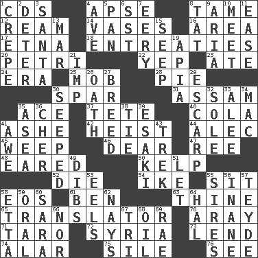 ACROSS 1. Music discs 4. Domed church section 8. Docile 12. 480, 500 or 516 sheets of paper 14. Flower holders 16. Type of rug 17. Inactive volcano in Sicily 18. Pleas 20. _ dish (used to culture cells) 22. Slangy assent 23. Had dinner 24. Epoch 25. Disorderly crowd 28. Sliced dessert 30. Coast Guard woman 31. Indian state 35. Adept person 37. Wig 40. Root beer relative 41. American tennis player Robert 42. Robbery 44. Actor Baldwin 45. Shed a tear 46. Letter starter 47. To riddle 48. Having ears or earlike features 50. Seaweed 52. Expire 54. Mamie's mate 55. Be seated 58. Greek goddess of the dawn 61. Benjamin's nick name 63. One or ones belonging to thee 65. Interpreter 70. Like ___ of sunshine 71. Pacific island yam 72. Damascus' land 73. Grant temporary use of 74. Having or resembling wings 75. Drop; flow; fall 76. Perceive with the eye DOWN 1. Streamer paper 2. Prevent from occurring 3. Before Barbara or Clara 4. "___ Maria" 5. Baking dish 6. Fast jet (abbr.) 7. Suggestive of the supernatural 8. Make lace 9. Operatic vocal solo 10. Rendezvous 11. Relaxation 13. Third mo. 15. Ooze 19. Capital of Western Samoa 21. Mischievous child 26. Pledge 27. A special lineage 29. Fortification 30. Oozed 32. Flatfish 33. Toward shelter 34. Big _ 35. Toward the sea 36. "Mermaids" star 38. Neckwear 39. 1973 Nobel Price Winner (Physics) Leo 41. Deep reverence 43. Long journey 49. Rights 51. Allow 53. Snakelike fish 55. Male parents of animals 56. Silly 57. Miss Universe 1986, Barbara Palacios _ 58. Singer James 59. Taken by mouth 60. "Two Mules for Sister ____" 62. Negative votes 64. Actor Linden 66. Not either 67. Three (prefix) 68. Lubricate 69. Actress Charlotte