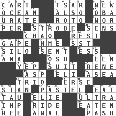 ACROSS 1. Heavy open wagon 5. Russian ruler of old 9. ___ Haven, CT 12. Sea 14. In addition 15. Chief or king in Benin or Nigeria 16. A salt of uric acid 17. Printing process, for short 18. Not either 19. For each 20. Disco prop 23. Elected reps. 24. US Secretary of Labor Elaine L. _ 25. Remainder 27. Open wide 30. Madame (abbr.) 32. Fast jet (abbr.) 33. Grain storage tower 34. Posted 36. Double-curved letter 38. Housemaid (var.) 39. Bear (Spanish) 40. Car or cant ending 43. Slangy assent 46. Set or collection 48. French philosopher Descartes 49. Viper 51. Connecticut Ivy Leaguer 52. At sea 53. Musical group of three 54. Celtic language 56. Comedian Laurel of Laurel & Hardy 58. Soft color 61. Erode 64. The 19th letter of the Greek alphabet 65. Writer Wiesel 66. Extremist 68. Mischievous child 69. Travel on or in a vehicle 70. Eroded 71. Portuguese money of account (variant) 72. Of or related to the anus 73. Romantic infatuation DOWN 1. Clever action or accomplishment 2. 43,560 square feet 3. Tail end 4. Make lace 5. Pacific island yam 6. Messy guy 7. Michaelmas daisies 8. Friend of Pooh 9. Music written for nine 10. Inky black, to poets 11. Armed conflicts 13. Delicate 21. Scottish caps 22. Lover boys 23. Fast planes 24. Corporate head (abbr.) 26. Compass dir. 27. Girls' org. (abbr.) 28. Direct toward a target or goal 29. Frolic 31. Follow as a consequence or result 35. Bathroom 37. Perceives with the eye 41. Compass dir. 42. Teachers' org. 44. Merit 45. Air pressure measure (abbr.) 47. Become fatigued 48. Actress Charlotte 50. Cotton for raincoats, e.g. 53. Grayish beige 55. Change direction abruptly 56. Use a spoon 57. Docile 59. Opera by Verdi 60. Sew up the eyelids of hawks and falcons 61. Singer James 62. Ancient Greek god of war 63. Hyperbolic tangent 65. Period 67. Pet locale