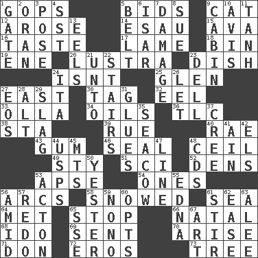 ACROSS 1. Republicans 5. Auction offers 9. Feline 12. Came up 14. Son of Isaac 15. Actress Gardner 16. Clothes sense 17. Unable to walk 18. Storage container 19. Compass dir. 20. A period of five years 23. Food container 24. Is not 25. Small, secluded valley 27. Compass direction 30. Label 32. Snakelike fish 33. Water jar 34. Petroleums 36. Affectionate concern, for short 38. R.R. building 39. Regret 40. Actress Charlotte 43. Chewing product 46. Lick closed 48. To provide with a ceiling 49. Filthy place 51. _-fi 52. Habitations of wild animals 53. Domed church section 54. Singles 56. Arches 58. Frozen precipiation fell 61. Ocean 64. Was introduced to 65. Obstruct or block passage 66. Relating to or accompanying birth 68. Wedding promise 69. Posted 70. Ascend 71. Spanish title 72. Greek god of love 73. Woody plant DOWN 1. Yard entry 2. Northwest Algerian city 3. Airs 4. Fast jet (abbr.) 5. Waist strap 6. Austrian river, tributary to the Danube 7. Break 8. Take to court 9. Apartment or room in a ship 10. Opinion 11. Hyperbolic tangent 13. Snakelike fish 21. To (old English) 22. Flight of steps 23. Small valley 24. Call ___ day 26. Allow 27. Greek goddess of the dawn 28. Keyboard modifier key 29. Volcanic refuse 31. Adhesives 35. Manatee 37. Algonquian 41. The 18th letter of the Arabic alphabet 42. Raised railways 44. United States Postal Service (abbr.) 45. Mountains (abbr.) 47. Actor's bit 48. Music discs 50. Of or pertaining to yesterday 53. 13-14th century defensive garment 55. Pulitzer Prize-winning author Ferber 56. Among 57. Make new 59. Words to Nanette 60. Chooses 61. Use a spoon 62. Relaxation 63. Toward shelter 65. Compass dir. 67. Tate display
