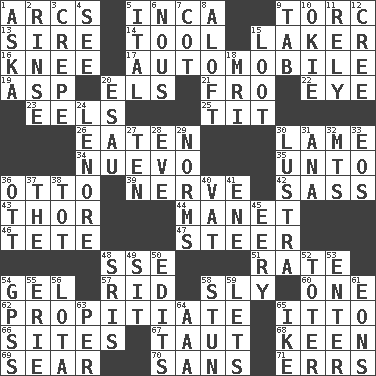 ACROSS 1. Arches 5. South American Indian 9. Torque (variant) 13. Title for a man of rank and authority 14. Utensil 15. Member of a famous L.A. basketball team 16. Leg joint 17. Form of transportation 19. Cleo's killer 20. Raised railways 21. From 22. Sight organ 23. Snakelike fish 25. Teat (slang) 26. Consumed 30. Unable to walk 34. New (sp.) 35. To (old English) 36. Von Bismarck 39. Impudent aggressiveness 42. Backtalk 43. Son of Odin 44. French painter Edouard 46. Wig 47. Guide 48. Compass dir. 51. Pace 54. Set 57. To free from 58. Cunning 60. Single 62. Appease 65. "Tell ____ the Marines!" 66. Settings 67. Pulled tight 68. Peachy ____! 69. Dry up 70. Without 71. Blunders DOWN 1. "____ silly question..." 2. Wash lightly 3. Streamer paper 4. Observe 5. Slanted text style (abbr.) 6. Horse sense 7. Small bed 8. Upward 9. Bar bill 10. Migrant worker of the '30s 11. Depend 12. Algonquian 15. Plunder 18. Medical imaging device (abbr.) 20. He sold his birthright 24. Poe poem 27. "___ Little Indians" 28. Night before a holiday 29. Typical models 30. A period of five years 31. Santa ___, CA 32. Mountains (abbr.) 33. Greek goddess of the dawn 36. Baseball player Mel 37. Definite Article 38. Small child 40. Large container 41. Compass dir. 45. Suggestive of the supernatural 48. Indian titles of respect 49. Be seated 50. Proofreads 52. Carrier 53. Keyboard key 54. Global Positioning Systems (abbr.) 55. 4th largest of the Great Lakes 56. Globular water bottle used in Asia 58. Astound 59. Allows 61. Immeasurably long periods of time 63. For each 64. American Automobile Association (abbr.) 65. Eisenhower's nickname