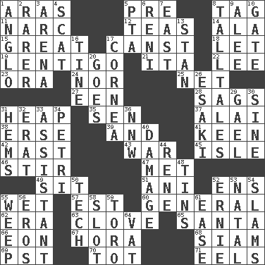 ACROSS 1. Caspian sea tributary 5. Before (prefix) 8. Label 11. Drug cop 12. Beverages made from leaves 14. Chicken ___ king 15. Relatively large 17. 2nd pers. sing. pres. of can (arch.) 18. Allow 19. Small, flat, pigmented spot on the skin 21. Call ___ day 22. Area sheltered from the wind 23. Mouth or opening 24. And not 25. Fish or hair follower 27. Car or cant ending 28. Droops 31. Pile 35. Elected rep. 37. Jai _ 38. Celtic language 39. Also 41. Peachy ____! 42. Vertical spar for supporting sails 43. Armed conflict 45. Capri or Wight 46. Use a swizzle stick 47. Was introduced to 49. Be seated 51. Black tropical American cuckoo 52. Followers of ems 55. Soggy 57. Eastern Standard Time (abbr.) 60. Commissioned military rank 62. Epoch 63. Garlic unit 65. Before Barbara or Clara 66. Age 67. Israeli folk dance 68. Thailand, formerly 69. Pacific Standard Time (abbr.) 70. Small child 71. Snakelike fish DOWN 1. White American of non-Hispanic descent 2. Less widely known 3. Sports stadium 4. Scram! 5. Parent Teacher Assoc. 6. Painter Guido (1575-1642) 7. 90 degrees 8. Baron Munchausen's specialties 9. Toward shelter 10. Yard entry 13. Comedian Laurel of Laurel & Hardy 16. Prong on a fork 17. Pupil covering 20. Travels 26. 1973 Nobel Price Winner (Physics) Leo 29. Highlander 30. Trig term 31. Cloth borders 32. Part of Q.E.F. 33. Helper 34. _ dish (used to culture cells) 36. Compass dir. 40. Break 44. French philosopher Descartes 48. Airtight sealed metal containers 50. Technical 52. Bert's buddy 53. Relating to or accompanying birth 54. Shuts with force 55. Shed a tear 56. Greek god of love 58. Slit 59. "Corrida" creature 61. Relaxation 64. Large container