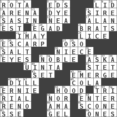 ACROSS 1. Round or rotation of duties 5. Begley and Asner 8. Hat (slang) 11. Sports stadium 13. Color 14. Father 15. Indian antelope 16. Teachers' org. 17. ____ Jay Lerner 18. Eastern Standard Time (abbr.) 19. Mild oath 21. Naughty children 22. "If ____ say so..." 24. Louse (plural) 25. Fortification 27. Bear (Spanish) 29. Table seasoning 30. Sibling's daughter 32. Sight organs 33. Having high moral qualities 35. "____ silly question..." 39. National forest in Provo, Utah 41. Proofreading order 42. Put into a specified state 43. Develop 45. Deli pickle 48. Root beer relative 49. Bert's buddy 50. Parka part 52. Three (prefix) 55. Monetary unit of Yemen 56. And not 57. Keyboard key 59. Former U.S. Attorney General Janet 60. Nursemaid (var.) 61. Biscuitlike quick bread 62. Compass dir. 63. Set 64. Washington bills DOWN 1. Raze (variant) 2. Mouths or openings 3. One of the two male reproductive glands 4. Black tropical American cuckoo 5. Pulitzer Prize-winning author Ferber 6. Colored 7. Ocean 8. Pale purple color 9. Feeling or showing extreme anger 10. Lairs 12. Approach 14. Indian skirt 20. Swindle 21. Coalition 23. Taiwanese island in East China Sea 25. Compass dir. 26. Declare 27. Lubricate 28. Observe 30. Basketball assoc. 31. Artist's stand 33. Compass dir. 34. Baseball player Mel 36. Ski resort town in Vermont 37. Barrel 38. Had dinner 40. Small island 43. Environmental prefix 44. Methods 45. Frees from moisture 46. Empty; void 47. _ and Stitch 49. Blunders 50. Residence 51. Spoken 53. French philosopher Descartes 54. Angers 56. Tired old horse 58. Non-commissioned officer (abbr.)