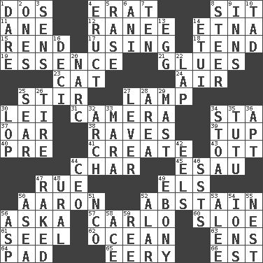 ACROSS 1. Two (Sp.) 4. Part of Q.E.F. 8. Be seated 11. One (Scot) 12. Indian princess (variant) 14. Inactive volcano in Sicily 15. Tear apart 17. Exploiting 18. Look after 19. Core 21. Adhesives 23. Domesticated feline 24. Wind 25. Move through with a circular motion 27. Desk light 30. Flowery wreath 31. Device for capturing images 34. R.R. building 37. Rowing implement 38. All-night dance parties 39. Uncastrated adult male sheep 40. Before (prefix) 41. Cause to be 43. Baseball player Mel 44. Burn to charcoal 45. He sold his birthright 47. Sorrow 49. Raised railways 50. Composer Copland 52. Choose not to consume 56. "____ silly question..." 57. Monte _, Las Vegas Hotel/Casino 60. A type of plum 61. Sew up the eyelids of hawks and falcons 62. Sea 63. Followers of ems 64. Writing tablet 65. Suggestive of the supernatural 66. Eastern Standard Time (abbr.) DOWN 1. Have the gumption 2. Washington bills 3. Elected reps. 4. Spew [out] 5. To erase 6. Cuckoo 7. "___ Little Indians" 8. Navigate 9. Taverns 10. Small amount or degree 13. Oval reproductive body of a fowl 14. Needle case 16. Tenth: prefix 20. Drug cop 22. Infant locale 25. Wither 26. Hoop that covers a wheel 27. Prying instrument 28. Length times width 29. Vertical spar for supporting sails 30. Trim (branches) 32. Bowlike part 33. Hindu Mythology: god of death 34. Portico 35. Ballerina skirt 36. Fitting 42. Snakelike fish 44. Corporate head (abbr.) 46. Fast planes 47. Moved through 48. Mountain range 49. Dark wood 50. Toward the sea 51. Non-commissioned officer (abbr.) 52. Having or resembling wings 53. Toward shelter 54. Charged particles 55. Egg locale 56. Cleo's killer 58. Adept person 59. To separate or throw off