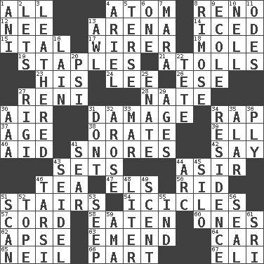ACROSS 1. Everything 4. Tiny particle 8. Former U.S. Attorney General Janet 12. Born 13. Sports stadium 14. On the rocks 15. Slanted text style (abbr.) 17. One who wires 18. Undercover agent 19. Paper fasteners 21. Ringlike coral islands and reefs 23. Part of HMS, perhaps 24. Area sheltered from the wind 26. Compass dir. 27. Painter Guido (1575-1642) 28. Nathan's nickname 30. Wind 31. Break 34. Strike 37. Personal question 38. Declaim 39. Pipe bend 40. Assist 41. Sounds asleep 42. Declare 43. Puts into a specified state 44. SW Saudi Arabia district 46. Afternoon social gathering 47. Raised railways 50. To free from 51. Flight of steps 54. Winter's stalactites 57. Drawstring 58. Consumed 60. Washington bills 62. Domed church section 63. Make improvements or corrections to 64. Auto 65. Famous astronaut Armstrong 66. Piece 67. Connecticut Ivy Leaguer DOWN 1. Cuckoo 2. Allows 3. Resembling or made to resemble leather 4. Satellite of Uranus 5. Laconic 6. Single 7. Hindu Mythology: god of death 8. Full of chinks, cracks, or crevices 9. Learning spot: Fr. 10. 1994 drama film starring Jodie Foster 11. Lyric poems 13. Leather borer 16. (Had) reclined 20. Air pressure measure (abbr.) 22. False hair 25. Maternal 27. Swiss mountan, "Queen of the Mountains" 29. Eons 30. American Automobile Association (abbr.) 31. Do not 32. Came up 33. Impair 34. Dwelling 35. Having or resembling wings 36. Strand of rope, yarn or thread 41. Singe 43. Beer mug 44. Curve 45. Grain storage tower 46. Tarsus (plural) 48. 61 cubic inches 49. Odor 51. Glance over 52. Drink excessively 53. Ooze 55. Working for oneself (abbr.) 56. Lick closed 59. Nursemaid (var.) 61. Indian title of respect (Mr.)