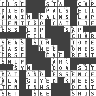 ACROSS 1. Otherwise 5. R.R. building 8. Head covering 11. Passed on 12. Friends 14. Connecticut Ivy Leaguer 15. At full speed 17. Insides of hands 18. Pet locale 19. Small, flat, pigmented spot on the skin 21. Feline 22. Falsehood 23. Double-curved letter 24. Trim (branches) 25. Plant excrement 27. Snakelike fish 28. Burn to charcoal 31. Oceans 35. Title for a knight 37. Heavy book 38. Relaxation 39. Born 41. Singles 42. Celtic language 43. Night before a holiday 45. Monthly bill 46. Sever or remove by pinching or nipping 47. Curve 49. Symbol (abbr.) 51. ___ good deed 52. Be seated 55. Floor protector 57. Added to 60. Core 62. According to 63. Steadied 65. Leg joints 66. Nine, plus one 67. Lodging establishments 68. Gouge 69. Arrange properly for use 70. Observe 71. Indian titles of respect DOWN 1. Peak District village in England 2. Citrus fruits 3. Actors Connery and Penn 4. Prepare for publication 5. Health resort 6. Baby powder 7. _ mater 8. Portable communications device 9. Mountain range southwest of Kyrgyzstan 10. Corncob 13. Fast planes 16. The longest river in the world 17. Cotton for raincoats, e.g. 20. Moves 26. Thespian 29. So be it 30. Repose 31. Perceives with the eye 32. Merit 33. Helper 34. Not well drained, as in land 36. To riddle 40. Dodged 44. Greek god of love 48. Keg 50. Wise men 52. Contemptuous expression 53. Ancient Celtic tribe of eastern Britain 54. Trials 55. Floor coverings 56. Toward shelter 58. Religious women 59. Unit of force 61. Conclusions 64. Compass dir.
