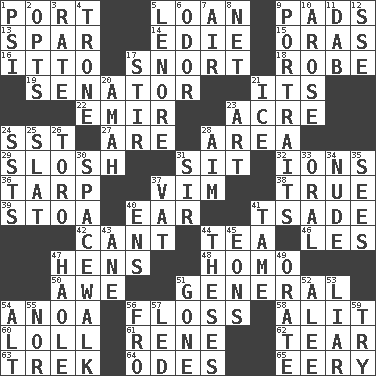 ACROSS 1. Sweet dark-red dessert wine 5. Grant temporary use of 9. Groovy apts. 13. Coast Guard woman 14. Singer Brickell 15. Mouths or openings 16. "Tell ____ the Marines!" 17. Derisive sound 18. Loose flowing garment 19. Elected representative 21. ___ a Wonderful Life 22. Independent ruler or chieftain 23. Land measure 24. Fast jet (abbr.) 27. "We ___ not amused" (Victoria) 28. Type of rug 29. Agitate, as a liquid 31. Be seated 32. Charged particles 36. Canvas cover 37. Zeal 38. Loyal 39. Portico 40. Ewer handle 41. Sadhe (variant) 42. Patter 44. Afternoon social gathering 46. French article 47. Coop moms 48. Like (prefix) 50. Deep reverence 51. Commissioned military rank 54. Small Philippine buffalo 56. Soft thread for cleaning between teeth 58. Set down 60. Hang loosely or laxly 61. French philosopher Descartes 62. Pull into pieces 63. Long journey 64. Lyric poems 65. Suggestive of the supernatural DOWN 1. 23rd letter of the Greek alphabet 2. Elects 3. Assign a rank or rating to 4. Heavy duty weighing machine 5. Poe poem 6. Aroma 7. Atmosphere 8. Fish or hair follower 9. Likenesses of persons 10. Came up 11. Pat or tap gently 12. Compass dir. 17. Tumult 20. Housemaid 21. Frozen water 23. Nonscientific branch of learning 24. Fast planes 25. Narrow board 26. "Corrida" creature 28. Direct toward a target or goal 30. High altitude stroll 31. Title for a knight 33. Of the mouth 34. Unadorned 35. Perceives with the eye 37. Large container 40. Followers of ems 41. Not wild 43. One (Scot) 44. College papers 45. Immeasurably long periods of time 47. White Person, in Hawaii 49. Speak pompously 51. Went 52. Toward shelter 53. One who doesn't tell the truth 54. Keyboard modifier key 55. Or not 56. Away 57. Directed 59. Attempt to accomplish something