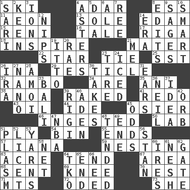ACROSS 1. What Jean-Claude Killy likes to do 4. The sixth month of the Jewish calendar 8. Double-curved letter 11. A really long time 13. Not divided or shared with others 14. Dutch treat 15. Painter Guido (1575-1642) 16. Falsehood 17. Port city in Latvia 18. Motivate 21. Mother 22. Play the lead 23. Standoff 25. Fast jet (abbr.) 26. _ tizzy (2 wds.) 29. One of the two male reproductive glands 32. Role for Stallone 34. "We ___ not amused" (Victoria) 35. Cuckoo 38. Small Philippine buffalo 39. Moved through 41. Make new 43. Petroleum 44. Binary compound 45. Flexible twig of a willow tree 46. Swallowed 50. Experiment locale 51. Travel a route regularly 54. Storage container 55. Conclusions 57. Woody, climbing, usually tropical plant 59. Inhabiting a nest 63. Land measure 64. Look after 67. Type of rug 68. Emitted 69. Leg joint 70. Egg locale 71. Mountains (abbr.) 72. Wrote a lyric poem 73. A female animal or person DOWN 1. Indian skirt 2. Peachy ____! 3. Charged particles 4. Michaelmas daisies 5. ___ good deed 6. 100% 7. To riddle 8. Proofreads 9. Gurus 10. Don Adams' spy role 12. Pinches, bites 14. Period 19. "Tell ____ the Marines!" 20. Actress Charlotte 21. Cartoonist voice _ Blanc 23. Become fatigued 24. On the rocks 26. Retirement account (abbr.) 27. Billionth: prefix 28. Mine, in Marseilles 30. Receives possession of 31. Hearing organs 33. Indonesian resort city 36. Famous astronaut Armstrong 37. It may be bright or harebrained 39. Swiss mountan, "Queen of the Mountains" 40. Arabian gulf 42. Globe 45. Likelihood 47. Basketball assoc. 48. Watched over 49. Compass dir. 51. Suffix with ecto or cyto 52. It is permitted: Lat. 53. Entertaining tales 56. Comedian Laurel of Laurel & Hardy 58. Fish or hair follower 60. Angers 61. Soft 62. Yard entry 64. Ring climax 65. Conclude 66. Born