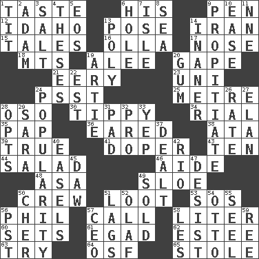 ACROSS 1. Clothes sense 6. Part of HMS, perhaps 9. Fenced enclosure 12. Potato state 13. Introduce or present, as a question 14. SW Asia republic 15. Stories 16. Rounded earthenware pot or jar 17. Olfactory organ 18. Mountains (abbr.) 19. Toward shelter 20. Stare wonderingly 21. Suggestive of the supernatural 23. Corn or form start 24. Inconspicuous attention getter 25. Distance measurement (Brit.) 28. Bear (Spanish) 30. Likely to tip or tilt 34. Monetary unit of Yemen 35. Infant food 36. Having ears or earlike features 38. "One Day ___ Time" 39. Loyal 41. Drug addict 43. Nine, plus one 44. First course 46. Helper 48. White ___ sheet 49. A type of plum 50. Ship's personnel 51. Plunder 53. Distress signal 56. Silvers or Donahue 57. Give a ring to 58. 61 cubic inches 60. Puts into a specified state 61. Mild oath 62. First name in cosmetics 63. Attempt 64. Order of Saint Francis (abbr.) 65. Took without asking DOWN 1. Teat (slang) 2. First of billions? 3. Table seasoning 4. College papers 5. Greek goddess of the dawn 6. Opening into or through something 7. Capri or Wight 8. Ocean 9. Conciliate 10. Comfort 11. Compass dir. 13. Much (prefix) 14. Sillier 19. Nick name for Arthur 20. Chewing product 22. Eastern Standard Time (abbr.) 24. Teen's desire 26. Assign a rank or rating to 27. Enthusiasm 28. Elects 29. "Two Mules for Sister ____" 31. Writing tablet 32. Adept person 33. Slangy assent 37. Started a card game 40. Artist's stands 42. _ de Janeiro 45. Fool 47. Stop 49. Exchanged or delivered for money 50. "Mermaids" star 51. Fails to keep up a pace 52. Norwegian king 54. Von Bismarck 55. Stitch closed the eyes of (a falcon) 56. Pacific Standard Time (abbr.) 57. Corporate head (abbr.) 58. French article 59. To sift