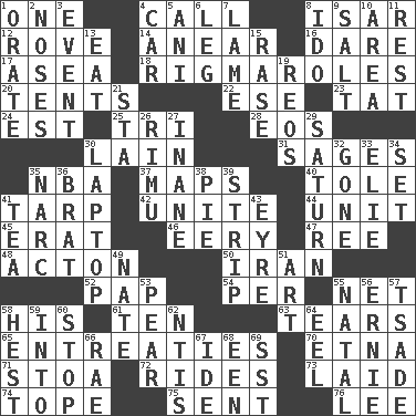ACROSS 1. Single 4. Give a ring to 8. Austrian river, tributary to the Danube 12. Be footloose 14. Approach 16. Have the gumption 17. At sea 18. Frustrating wastes of time 20. Portable shelters 22. Compass dir. 23. Make lace 24. Eastern Standard Time (abbr.) 25. Three (prefix) 28. Greek goddess of the dawn 30. (Had) reclined 31. Gurus 35. Basketball assoc. 37. Atlas contents 40. Lacquered or enameled metalware 41. Canvas cover 42. Join together 44. A single undivided whole 45. Part of Q.E.F. 46. Suggestive of the supernatural 47. To riddle 48. NE Massachussets city 50. SW Asia republic 52. Infant food 54. For each 55. Fish or hair follower 58. Part of HMS, perhaps 61. Nine, plus one 63. Rends 65. Pleas 70. Inactive volcano in Sicily 71. Portico 72. Amusement-park features 73. Put down 74. Drink excessively 75. Emitted 76. Area sheltered from the wind DOWN 1. Declaim 2. Olfactory organs 3. Incident 4. 4-wheeled motor vehicle 5. Black tropical American cuckoo 6. Part of a journey 7. Unable to walk 8. Wedding promise 9. Table seasoning 10. Length times width 11. Remainder 13. Ingest 15. To erase 19. Vintage cars 21. R.R. building 26. Tall New Zealand timber tree 27. Empty; void 29. Titan orbits this 30. Portable computer 32. Went 33. Writer Wiesel 34. Put into a specified state 35. Drug cop 36. Naughty child 38. Sliced dessert 39. Long narrow piece of something 41. Beverage made from leaves 43. Jane of fiction 49. Nathan's nickname 51. Nonscientific branch of learning 53. Lightbulb-shaped fruit 55. Brizilian seaport 56. Bert's buddy 57. Sadhe (variant) 58. Command 59. To the inside or interior of 60. Obstruct or block passage 62. Nuclear Threat Initiatives 64. Snakelike fish 66. Actress Charlotte 67. Binary compound 68. Car or cant ending 69. Fast jet (abbr.)