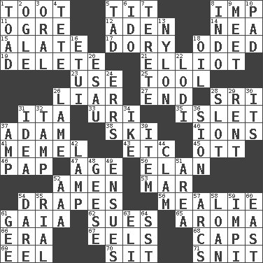 ACROSS 1. A blast of a horn 5. Teat (slang) 8. Naughty child 11. Legendary monster 12. Arabian gulf 14. Teachers' org. 15. Having winglike extensions 17. Rowboat 18. Wrote a lyric poem 19. Erase 21. American author Paul (1891-1958) 23. Purpose 25. Implement 26. One who doesn't tell the truth 27. Conclude 28. Indian title of respect (Mr.) 31. Call ___ day 33. RI univ. 35. Small island 37. First of billions? 38. What Jean-Claude Killy likes to do 40. Charged atoms 41. Klaipeda city 43. And so on (abbr.) 45. Baseball player Mel 46. Infant food 47. Mature 50. Flair 52. So be it 53. Impair 54. Window treatments 56. Ear of corn 61. Greek goddess of the earth (variant) 62. Institutes legal proceedings 65. Odor 66. Period 67. Snakelike fish 68. Balmoral and tarboosh 69. Snakelike fish 70. Be seated 71. In a ____ (agitated or irritated) DOWN 1. Frog relative 2. Stare at amorously 3. Taken by mouth 4. Wig 5. Bit 6. Wedding promise 7. Cylindrical with tapered ends 8. Southeast Asian peninsula 9. Confront 10. Groovy apt. 13. High-strength synthetic material 16. Needle holder 18. Lubricate 20. He sold his birthright 22. Farming town in central California 24. Blunders 26. Unable to walk 28. Position in a hierarchy or organization 29. Monthly bill 30. ___ a Wonderful Life 31. The main thing one is thinking about 32. Pack (down) 34. Eisenhower's nickname 36. The Jewish people; Israel 37. Electrical Unit 39. A distinct part 42. Desk light 44. Burrowing marine mollusk 48. Honkers 49. Follows as a consequence or result 51. Type of rug 52. Auto club (abbr.) 54. Have the gumption 55. Monetary unit of Yemen 57. Arches 58. Grant temporary use of 59. Body of Kaffir warriors 60. Compass direction 61. Turn to the right 63. Biblical high priest 64. Fast jet (abbr.)