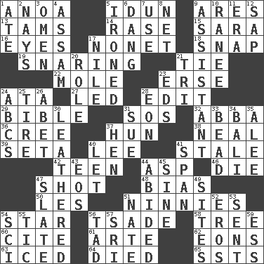 ACROSS 1. Small Philippine buffalo 5. Goddess of spring and wife of Bragi 9. Ancient Greek god of war 13. Scottish caps 14. Raze (variant) 15. "Two Mules for Sister ____" 16. Snake ____ (dice throw) 17. Music written for nine 18. Fastener 19. Catching in a trap 21. Neckwear 22. Undercover agent 23. Celtic language 24. _ moment's notice (2 wds.) 27. Directed 28. Prepare for publication 29. The Good Book 31. Mayday 32. Swedish rock group 36. Algonquian 37. Attila the _ 38. Be tempered by heat 39. Stalk of a moss capsule 40. Area sheltered from the wind 41. Having lost freshness 42. Adolescent 44. Viper 46. Pass on 47. Attempt 48. Prejudice 50. French article 51. Simpletons 54. Play the lead 56. Sadhe (variant) 58. Woody plant 60. Quote 61. Johnson of "Laugh-In" 62. Immeasurably long periods of time 63. On the rocks 64. Passed on 65. Fast planes DOWN 1. Had dinner 2. Negative votes 3. Presage 4. Indian state 5. Pressed 6. Mild oath, euphamism for damn 7. Purpose 8. Fish or hair follower 9. Helper 10. Indian princess (variant) 11. Period 12. Plant excrement 17. The longest river in the world 20. Hero or heavy, e.g. 21. Three (prefix) 23. Begley and Asner 24. Lettered men learn these first 25. Become fatigued 26. Collude with 28. Period of immesurable duration 30. Tough but pliablecoriaceous 31. Take to court 33. Necklace unit 34. Indonesian resort city 35. Toward shelter 37. Layer 40. Allow 41. Connect, as a bridge 43. Greek goddess of the dawn 44. Remained 45. Trig term 47. Chalkboard 49. Locates 51. Nathan's nickname 52. Greek god of love 53. Posted 54. _-fi 55. Nervous spasm 56. Small amount or degree 57. _ Lanka 59. Double-curved letter