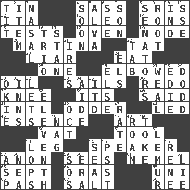 ACROSS 1. Metal container 4. Backtalk 8. Indian titles of respect 12. Call ___ day 13. Butter sub 14. Immeasurably long periods of time 15. Trials 18. Baking chamber 19. Thickened enlargement 20. Chrissie's court nemesis 22. Make lace 23. One who doesn't tell the truth 24. Consume 25. Single 26. Turned at an angle; bent 30. Lubricate 33. Travel by water 36. Make new 37. Leg joint 39. ___ a Wonderful Life 40. Stated 41. International (abbr.) 42. More peculiar 44. Directed 45. Gist 47. Nonscientific branch of learning 50. Large container 51. Utensil 53. Part of a journey 54. Orator 57. Soon (poet.) 59. Perceives with the eye 61. Klaipeda city 63. Back-to-school mo. 64. Mouths or openings 65. Corn or form start 66. Romantic infatuation 67. Table seasoning 68. Portuguese money of account (variant) DOWN 1. Teat (slang) 2. A distinct part 3. Rhinal 4. Within a short period 5. Inventor's middle name 6. Perceive with the eye 7. Manchild 8. Legislators 9. Carrot, for example 10. Working for oneself (abbr.) 11. Compass dir. 16. Musical group of three 17. Comedian Laurel of Laurel & Hardy 21. Angers 22. Bar bill 24. Raised railways 26. Otherwise 27. Welt 28. Singer Brickell 29. Texas town _ City 30. Migrant worker of the '30s 31. Lodging establishments 32. Allows 34. Helper 35. It would 38. Veterans Day date 42. Sep. follower 43. Assign a rank or rating to 46. Tired old horse 48. Wander aimlessly 49. Casino tip 52. Arboreal primate 53. Chops off 54. Lick closed 55. Inconspicuous attention getter 56. French philosopher Descartes 57. Cleo's killer 58. Teachers' org. 59. Mayday 60. Epoch 62. Whopper