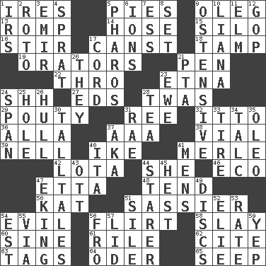 ACROSS 1. Angers 5. Sliced desserts 9. Cassini of fashion 13. Frolic 14. Stockings 15. Grain storage tower 16. Agitate 17. 2nd pers. sing. pres. of can (arch.) 18. Pack (down) 19. Speakers 21. Fenced enclosure 22. Through, poetically 23. Inactive volcano in Sicily 24. Quiet! 27. Begley and Asner 28. It was, poetically 29. Inclined to pout 31. Portuguese money of account (variant) 32. "Tell ____ the Marines!" 36. Silent film actress Nazimova 37. Auto club (abbr.) 38. Small bottle 39. 1994 drama film starring Jodie Foster 40. Eisenhower's nickname 41. Haggard of country music 42. Globular water bottle used in Asia 44. A female animal or person 46. Environmental prefix 47. Singer James 48. Be inclined (to) 50. Krazy ___ of comics 51. More disrespectful 54. Tending to cause great harm 56. Talk or behave amorously 58. Kill 60. Trig term 61. Cause heat under the collar 62. Quote 63. Labels 64. River in Europe 65. Ooze DOWN 1. Big collection agency 2. Printing process, for short 3. Arab leader 4. Small fatty European fish 5. N Egypt peninsula 6. Charged particles 7. Curvy letter 8. Put into a specified state 9. Clearly or manifestly demonstrative 10. Woody, climbing, usually tropical plant 11. Shade tree 12. Grand Old Party 17. Drawstring 20. Those people 21. Parent Teacher Assoc. 23. She-sheep 24. Connect, as a bridge 25. Opening into or through something 26. Frame or body of a ship 28. Beverage made from leaves 30. Baron Munchausen's specialties 31. Actress Charlotte 33. Become fatigued 34. Baby powder 35. Butter sub 37. Alias (abbr.) 40. Call ___ day 41. Not women's 43. Baseball player Mel 44. A viewer who gazes fixedly 45. Behest 47. Supplementing with great effort 49. Flat circles 51. Drop; flow; fall 52. Writer Wiesel 53. Assign a rank or rating to 54. Eastern Standard Time (abbr.) 55. By way of 56. Back 57. Flaplike covering 59. Slangy assent