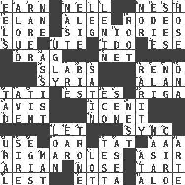 ACROSS 1. Merit 5. 1994 drama film starring Jodie Foster 9. Tender 13. Liveliness 14. Toward shelter 15. Cowboy competition 16. Old wives' tales, e.g. 17. Seigniories (variant) 19. Institute legal proceedings 20. Shoshoni 21. Wedding promise 22. Compass dir. 23. To be drawn or hauled along 25. Fish or hair follower 26. Broad, flat, thick pieces 30. Tear apart 34. Damascus' land 35. ____ Jay Lerner 36. Jacques of French films 39. _____ Park, CO 42. Capital of Latvia 43. Deliberation 44. Ancient Celtic tribe of eastern Britain 46. Gouge 47. Music written for nine 48. Allow 51. Synchronize (abbr.) 54. Purpose 57. Rowing implement 58. Make lace 60. American Automobile Association (abbr.) 62. Frustrating wastes of time 65. SW Saudi Arabia district 66. Believer in; advocate of (suffix) 67. Characteristic smell of wine 68. Small pie 69. For fear that 70. Singer James 71. Medicinal plant DOWN 1. Snakelike fish 2. Verbally 3. More valued for its uncommonness 4. Compass dir. 5. Political cartoonist Thomas 6. Writer Wiesel 7. Part of a journey 8. Soviet premier 1918-24 9. Or not 10. Singer Brickell 11. Observes 12. Stockings 15. Carrot, for example 18. Binary compound 20. Repulsive 24. Help 27. "We ___ not amused" (Victoria) 28. Again 29. Smooth fabric 30. Noteworthy scarcity 31. Connecticut Ivy Leaguer 32. Tired old horse 33. Heredity factor (abbr.) 36. Bit 37. "___ Maria" 38. Shallow baking pan 40. Environmental prefix 41. Elected rep. 45. Egg locale 48. Grant temporary use of 49. Ewer handle 50. Heavy duty weighing machine 52. Relating to the nose 53. Capital of Egypt 54. Mountain range 55. The founder of a family 56. Armor plate that protects the chest 58. Trial 59. At sea 61. Johnson of "Laugh-In" 63. Floor covering 64. Car dealer's back yard 65. _ moment's notice (2 wds.)