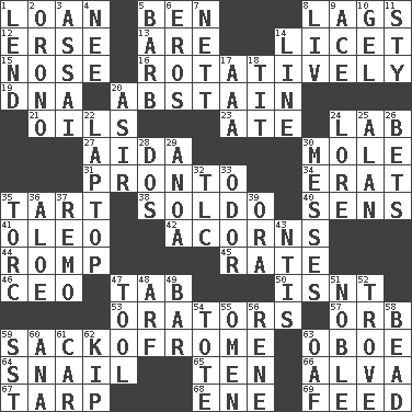 ACROSS 1. Grant temporary use of 5. Benjamin's nick name 8. Fails to keep up a pace 12. Celtic language 13. "We ___ not amused" (Victoria) 14. It is permitted: Lat. 15. Sense of smell 16. Rotating or pertaining to rotation 19. Heredity factor (abbr.) 20. Refrain by choice 21. Lubricates 23. Had dinner 24. Experiment locale 27. Opera by Verdi 30. Undercover agent 31. Right away 34. Part of Q.E.F. 35. Small pie 38. Twentieth part of a lira 40. Elected reps. 41. Margarine 42. Oak nuts 44. Play 45. Assign a rank or rating to 46. Corporate head (abbr.) 47. Keyboard key 50. Is not 53. Speakers 57. Globe 59. Italian handbag shop? 63. Mitch Miller's instrument 64. Slow-paced one 65. Nine, plus one 66. Inventor's middle name 67. Canvas cover 68. Compass dir. 69. Nourish DOWN 1. Grant temporary use of 2. U. of Maine site 3. Slender Brazilian palm 4. Born 5. Sharp remark 6. Greek god of love 7. Remaining after all deductions 8. 54 in ancient Rome 9. Adept person 10. Set 11. Filthy place 14. Actor's bit 17. Auto club (abbr.) 18. Teat (slang) 20. SW Saudi Arabia district 22. Portable computer 24. Old wives' tales, e.g. 25. Actor Alda or Thicke 26. Wagers 28. Two (Sp.) 29. Small Philippine buffalo 30. Makes clutter 32. Affectionate concern, for short 33. Aroma 35. Torque (variant) 36. Medicinal plant 37. San ____ (Riviera town) 39. Mouth or opening 43. Nuclear Threat Initiatives 47. Implement 48. Sandy's bark 49. Oblong piece of solid material 51. Having high moral qualities 52. Collection of objects 54. Haul 55. Sign of something about to happen 56. French philosopher Descartes 58. Necklace unit 59. Fast jet (abbr.) 60. Santa ___, CA 61. Automobile 62. Monetary unit of Laos 63. Clumsy lout