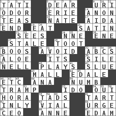 ACROSS 1. Jacques of French films 5. Letter starter 9. RI univ. 12. Aroma 13. One of the Great Lakes 14. At once, immediately (arch.) 15. Beverages made from leaves 16. Nathan's nickname 17. Opera by Verdi 18. Conclude 19. Consume 21. Smooth fabric 22. Observes 24. Compass dir. 26. Compass dir. 27. Showing deterioration from age 28. A blast of a horn 29. Expressions of contempt or scorn 30. Prevent the occurrence of 32. Lettered men learn these first 36. _ vera 37. ___ a Wonderful Life 38. Drop; flow; fall 39. 1994 drama film starring Jodie Foster 40. Frolics 42. Turn sharply 43. Promenade 44. Peak District village in England 46. And so on (abbr.) 49. Santa ___, CA 50. Unfeeling 51. _____ steamer (cargo ship) 53. Wedding promise 54. Fr. "Yes" 57. Israeli folk dance 58. Small boys 61. Small pie 62. Inwardly 63. Small bottle 64. Goad 65. Corporate head (abbr.) 66. Queen of England 1702-14 67. Dutch treat DOWN 1. Carryall 2. An important port of Yemen 3. Inedible or poisonous agaric 4. Big collection agency 5. Scratch 6. Epoch 7. Small island 8. To riddle 9. Join together 10. "The Thinker" sculptor 11. Silly 14. American Automobile Association (abbr.) 19. Snakelike fish 20. Toward the sea 21. Arrange properly for use 23. Artist's stand 24. Annoyingly loud 25. Allow head to fall sleepily 27. Not divided or shared with others 28. "_____ Recall" 29. Bar 31. Country residence 32. Indian state 33. Big road sign 34. A slight indication 35. Observe 40. Baking dish 41. Post 43. Atlas unit 45. Superhero pair 46. Principle of right and wrong 47. Marketplace scale 48. Monte _, Las Vegas Hotel/Casino 52. Fifth month 53. Capri or Wight 55. Capital and largest city of Mongolia 56. Detail 58. Federal power corp. 59. The 18th letter of the Arabic alphabet 60. One of the 12 tribes of Israel 61. Third day of the wk.