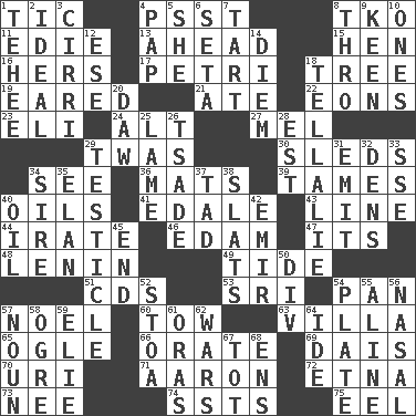 ACROSS 1. Nervous spasm 4. Inconspicuous attention getter 8. Ring climax 11. Singer Brickell 13. Having the leading position 15. Layer 16. Possessive pronoun 17. _ dish (used to culture cells) 18. Relationship diagram 19. Having ears or earlike features 21. Had dinner 22. Immeasurably long periods of time 23. Biblical high priest 24. The first octave above the treble staff 27. Cartoonist voice _ Blanc 29. It was, poetically 30. Bobsleighs 34. Observe 36. Floor coverings 39. Makes less strong or intense 40. Lubricates 41. Peak District village in England 43. Actor's bit 44. Feeling or showing extreme anger 46. Dutch treat 47. It is 48. Soviet premier 1918-24 49. Periodic rise and fall of the sea level 51. Music discs 53. Indian title of respect (Mr.) 54. Baking dish 57. Christmas carol 60. Pull behind 63. Country residence 65. Stare 66. Declaim 69. Raised platform 70. RI univ. 71. Composer Copland 72. Inactive volcano in Sicily 73. Born 74. Fast planes 75. Snakelike fish DOWN 1. Giggle 2. Standard of perfection 3. High-altitude cloud 4. Infant food 5. A female animal or person 6. Bristle 7. Small pie 8. Through, poetically 9. Peachy ____! 10. Singles 12. Compass dir. 14. South Vietnam president (1954) 18. Copy Pinocchio 20. Obsolete 25. Unable to walk 26. Sadhe (variant) 28. Eastern Standard Time (abbr.) 29. One of the two male reproductive glands 31. Send forth 32. Lairs 33. Compass dir. 34. Beget 35. Enthusiasm 37. Bit 38. Narrow boards 40. Lubricate 42. Arab leader 45. Conclude 50. HTML Container Element 52. Portico 54. Food holder 55. Place in a line 56. Relating to the nose 57. Part of speech 58. Legendary monster 59. Writer Wiesel 61. Mouths or openings 62. Armed conflicts 64. Binary compound 67. Small child 68. Followers of ems