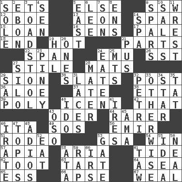 ACROSS 1. Arranges properly for use 5. Otherwise 9. Compass dir. 12. Mitch Miller's instrument 13. Age 14. Coast Guard woman 15. Grant temporary use of 16. Elected reps. 17. Diluted with white 18. Conclusion 19. Being at a high temperature 21. Components 22. Connect, as a bridge 24. Australian flightless bird 26. Fast jet (abbr.) 27. Vertical member of a panel or frame 28. Floor coverings 29. The Jewish people; Israel 30. Narrow boards 32. Mail 36. _ vera 37. Had dinner 38. Singer James 39. More than one (prefix) 40. Ancient Celtic tribe of eastern Britain 42. Not this but _ 43. River in Europe 44. More uncommon 46. Call ___ day 49. Distress signal 50. Independent ruler or chieftain 51. Cowboy competition 53. Girls' org. (abbr.) 54. Victory 57. Capital of Western Samoa 58. Operatic vocal solo 61. Periodic rise and fall of the sea level 62. A blast of a horn 63. Small pie 64. At sea 65. Double-curved letter 66. Domed church section 67. Welt DOWN 1. Flatfish 2. Inky black, to poets 3. Inedible or poisonous agaric 4. Elected rep. 5. Compass direction 6. Area sheltered from the wind 7. Boy, to dad 8. Followers of ems 9. Practice fights 10. Table seasonings 11. Obtain by seizing forcibly or violently 14. Health resort 19. Actor Linden 20. Washington bills 21. Fluid product of inflammation 23. Abounding in pines 24. Consumed 25. Mountains (abbr.) 27. Grain storage tower 28. Mother 29. Plant excrement 31. Shoestrings 32. _ dish (used to culture cells) 33. Else 34. Play the lead 35. Make lace 40. Wedding promise 41. Angers 43. Bear (Spanish) 45. Nanny (var.) 46. Feeling or showing extreme anger 47. Literary convention 48. Goodbye (Sp.) 52. Ingest 53. Yard entry 55. The main thing one is thinking about 56. Anneal 58. _ moment's notice (2 wds.) 59. Strike 60. Big collection agency 61. The 23rd letter of the Hebrew alphabet