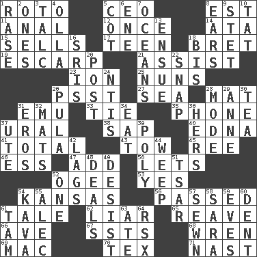 ACROSS 1. Printing process, for short 5. Corporate head (abbr.) 8. Eastern Standard Time (abbr.) 11. Of or related to the anus 12. At one time in the past 14. _ moment's notice (2 wds.) 15. Makes a sale 17. Adolescent 18. Cy Young winner Saberhagen 19. Fortification 21. Help 23. Electrically charged atom 25. Religious women 26. Inconspicuous attention getter 27. Ocean 28. Floor protector 31. Australian flightless bird 33. Make a knot 35. Give a jingle 37. Mountain range 38. Plant excrement 40. Pulitzer Prize-winning author Ferber 41. "_____ Recall" 43. Pull behind 45. Portuguese money of account (variant) 46. Curvy letter 47. Find the sum of 50. Allows 52. Double curve, resembling the letter S 53. Consenting reply 54. Sunflower state 56. Went by 61. Falsehood 62. One who doesn't tell the truth 65. Rob, plunder, or pillage 66. "___ Maria" 67. Fast planes 68. Songbird 69. Apple computer (short form) 70. John Ritter's dad 71. Political cartoonist Thomas DOWN 1. To erase 2. Singles 3. Baby powder 4. Spanish pot 5. Small bed 6. Compass dir. 7. Seas 8. Hearing organs 9. Proofreading order 10. Make lace 13. Follow as a consequence or result 16. Indian titles of respect 18. Altar cloth linen 20. Mail 22. Fastener 24. Nuclear Threat Initiatives 26. Monetary unit of Botswana 28. Method 29. Singer Murray 30. Afternoon social gathering 31. Greek god of love 32. Floor coverings 34. Erode 36. Possessive pronoun 37. Shoshoni 39. More than one (prefix) 42. Fails to keep up a pace 44. Shed a tear 48. Allots cards 49. Stop 51. Russian ruler of old 52. Single 54. Polynesian shrub of the pepper family 55. Actor Baldwin 57. Stitched 58. "Two Mules for Sister ____" 59. Nights before holidays 60. Scratch 61. Scottish cap 63. Had dinner 64. Acura sports coupe