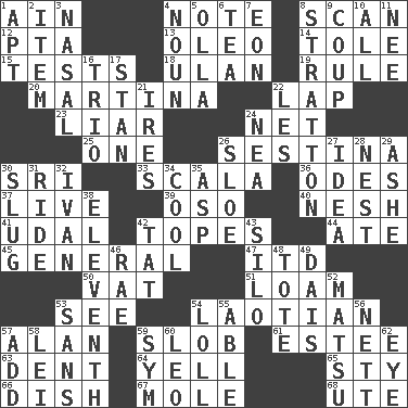 ACROSS 1. The 18th letter of the Arabic alphabet 4. Musical sound 8. Examine hastily 12. Parent Teacher Assoc. 13. Butter sub 14. Lacquered or enameled metalware 15. Trials 18. Uhlan (variant) 19. Court order 20. Chrissie's court nemesis 22. Pet locale 23. One who doesn't tell the truth 24. Fish or hair follower 25. Single 26. French poetic form 30. _ Lanka 33. Any of the three canals of the cochlea 36. Lyric poems 37. Not recorded 39. Bear (Spanish) 40. Tender 41. Hereditary estate 42. Drinks excessively 44. Had dinner 45. Commissioned military rank 47. It would 50. Large container 51. Rich soil 53. Observe 54. Of or relating to Laos or its people 57. Actor Alda or Thicke 59. Oscar Madison type 61. First name in cosmetics 63. Gouge 64. Shout 65. Filthy place 66. Food container 67. Undercover agent 68. Shoshoni DOWN 1. Fitting 2. A whole individual unit 3. Relating to the nose 4. Part of speech 5. Rounded earthenware pot or jar 6. Afternoon social gathering 7. Age 8. Ski resort town in Vermont 9. Overturn; upset 10. Everything 11. Born 16. Musical group of three 17. Comedian Laurel of Laurel & Hardy 21. Angers 22. French article 24. Teachers' org. 26. A type of plum 27. The main thing one is thinking about 28. A home for chicks 29. American tennis player Robert 30. Snaillike creature with no shell 31. Travel on or in a vehicle 32. "Terrible" tsar 34. Calm and collected 35. Cleo's killer 38. Veterans Day date 42. Make lace 43. Grain storage tower 46. Actress Charlotte 48. Lug 49. Raised platform 52. Taiwanese island in East China Sea 53. Without 54. Hang loosely or laxly 55. Competent 56. Remaining after all deductions 57. Increase 58. Flowery wreath 59. Symbol (abbr.) 60. Lion 62. Sight organ