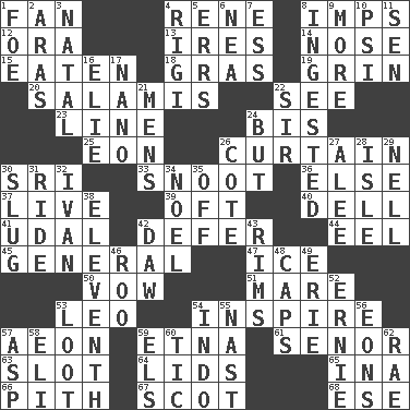 ACROSS 1. Air blower 4. French philosopher Descartes 8. Naughty children 12. Mouth or opening 13. Angers 14. Sense of smell 15. Ingested 18. Pate de foie ____ 19. Amused look 20. Deli grouping 22. Observe 23. Actor's bit 24. Altar cloth linen 25. Period of immesurable duration 26. Window treatment 30. _ Lanka 33. Snout, nose 36. Otherwise 37. Moving, as bait 39. Often (poetically) 40. Small valley 41. Allodial 42. Put off 44. Snakelike fish 45. Commissioned military rank 47. Frozen water 50. Solemn pledge 51. Female horse 53. Lion 54. Heighten or intensify 57. A really long time 59. Inactive volcano in Sicily 61. Sir (Sp.) 63. Notch 64. Hats (slang) 65. _ tizzy (2 wds.) 66. Heart or essence 67. Highlander 68. Compass dir. DOWN 1. Enemy 2. Ancient river in northeast Turkey 3. Brizilian seaport 4. Swiss mountan, "Queen of the Mountains" 5. Blunders 6. Teachers' org. 7. Double-curved letter 8. Consumed 9. Greater amount 10. Air pressure measure (abbr.) 11. Elected rep. 16. Writer Wiesel 17. Billionth: prefix 21. Not women's 22. Title for a knight 24. Yet 26. ____ d'Azur (French Riviera) 27. Toward shelter 28. Small island 29. 1994 drama film starring Jodie Foster 30. A hard, heavy blow 31. Travel on or in a vehicle 32. _ the terrible 34. Christmas carol 35. No longer planned or scheduled 38. Veterans Day date 42. Obsolete 43. Basketball hoops 46. Friend of Pooh 48. Balmoral and tarboosh 49. 4th largest of the Great Lakes 52. Bert's buddy 53. Spoils 54. _ china 55. Political cartoonist Thomas 56. Immeasurably long periods of time 57. Viper 58. Biblical high priest 59. Raised railways 60. Nervous spasm 62. Actress Charlotte