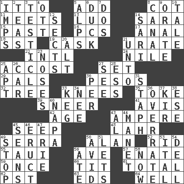 ACROSS 1. "Tell ____ the Marines!" 5. Find the sum of 8. Small bed 11. Confronts 13. Nilotic language 14. "Two Mules for Sister ____" 15. Thick mixture 16. Personal Computers (abbr.) 17. Of or related to the anus 18. Fast jet (abbr.) 19. Keg 21. A salt of uric acid 22. International (abbr.) 24. The longest river in the world 25. Buttonhole 27. Put into a specified state 29. Friends 30. Mexican monetary units 32. Woody plant 33. Leg joints 35. Puff or smoke 39. Contemptuous expression 41. Advice 42. Mature 43. Electrical Unit 45. Ooze 48. Cowardly lion portrayer 49. Spanish missionary in California 50. Actor Alda or Thicke 52. To free from 55. "Change" in Tahitian 56. "___ Maria" 57. Maternal 59. At one time in the past 60. Teat (slang) 61. "_____ Recall" 62. Pacific Standard Time (abbr.) 63. Begley and Asner 64. Not ill DOWN 1. Naughty children 2. Beverages made from leaves 3. A testis 4. Baseball player Mel 5. High mountains 6. Evade 7. Two (Sp.) 8. Lessep's creation 9. Declaim 10. Lie 12. Religious groups 14. Indian skirt 20. Keyboard modifier key 21. To (old English) 23. Olfactory organs 25. Fitting 26. 4-wheeled motor vehicle 27. Perceive with the eye 28. Double-curved letter 30. For each 31. Staphylococcus 33. Barrel 34. Born 36. Make much ado about nothing 37. Apertif with cassis 38. Compass dir. 40. California wine valley 43. Chicken ___ king 44. French painter Edouard 45. Actors Connery and Penn 46. Spew [out] 47. 4th largest of the Great Lakes 49. Obstruct or block passage 50. Enthusiastic 51. Allows 53. Slanted text style (abbr.) 54. Small valley 56. Had dinner 58. At this time