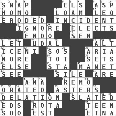 ACROSS 1. Fastener 5. Raised railways 8. Viper 11. Like (prefix) 12. Rich soil 13. Lion 14. Worn away 17. Happening 19. Refuse to acknowledge 21. Chooses 22. Inside; within (prefix) 23. Elected rep. 24. Allow 27. Allodial 29. Keyboard modifier key 32. Ancient Celtic tribe of eastern Britain 34. Distress signal 36. Operatic vocal solo 37. Greater amount 38. Small child 39. Puts into a specified state 40. Otherwise 41. R.R. building 42. French painter Edouard 43. Observe 44. Drop; flow; fall 46. "We ___ not amused" (Victoria) 47. Nanny (var.) 50. San ____ (Riviera town) 52. Declaimed 55. Michaelmas daisies 57. Accusation by an informer 59. Scheduled 62. Begley and Asner 63. Roll call or roster of names 64. Adolescent 65. "Barney Miller" actor Jack 66. Eastern Standard Time (abbr.) 67. Inactive volcano in Sicily DOWN 1. A female animal or person 2. Or not 3. Mine, in Marseilles 4. Porridge 5. Age 6. Shoestrings 7. Grin 8. Actor Baldwin 9. Posted 10. Cooking vessels 12. Whopper 15. World-weariness 16. Texas town _ City 18. Lair 20. Exposes to great heat 24. Citrus fruits 25. Learning spot: Fr. 26. Laconic 28. Plunders 29. Sports stadium 30. 61 cubic inches 31. Clothes sense 33. Born 35. Flight of steps 36. White ___ sheet 42. Klaipeda city 45. Allows 47. _ moment's notice (2 wds.) 48. Distance measurement (Brit.) 49. Goodbye (Sp.) 51. Speak pompously 52. Lyric poems 53. Make new 54. In addition 55. Santa ___, CA 56. Proofreading order 58. Baseball player Mel 60. Car or cant ending 61. Heredity factor (abbr.)