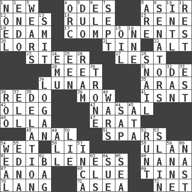 ACROSS 1. ___ Haven, CT 4. Lyric poems 8. SW Saudi Arabia district 12. Washington bills 14. General guideline 15. French philosopher Descartes 16. Dutch treat 17. Pieces 20. Australian parrot (variant) 21. Metal container 22. The first octave above the treble staff 23. Navigate 27. For fear that 29. Confront 31. Connecting point 34. Type of eclipse 35. Caspian sea tributary 36. Redecorate 39. Cut the grass 41. Is not 42. Cassini of fashion 43. Relating to the nose 46. Rounded earthenware pot or jar 47. Part of Q.E.F. 48. Of or related to the anus 51. Practice fights 54. Soggy 56. Cards in a Roman deck? 58. Uhlan (variant) 61. The property of being fit to eat 66. Nanny 67. Small Philippine buffalo 68. A slight indication 69. Canisters 70. Austrian-born American filmmaker Fritz 71. At sea 72. Fish or hair follower DOWN 1. Christmas carol 2. Inside; within (prefix) 3. Erodes 4. The grampus (Milton) 5. Superhero pair 6. Shade tree 7. Back-to-school mo. 8. "We ___ not amused" (Victoria) 9. Elected representatives 10. International (abbr.) 11. State of inaction 13. Stricken, poetically 18. Petroleum 19. Compass dir. 24. Australian flightless bird 25. Car or cant ending 26. 480, 500 or 516 sheets of paper 28. Slow-paced one 30. Marketplace scale 32. One of the 12 tribes of Israel 33. Eastern Standard Time (abbr.) 34. Utah city north of Ogden 36. Friend of Pooh 37. Pipe bend 38. Accusation by an informer 40. Armed conflicts 44. Plant excrement 45. _ moment's notice (2 wds.) 49. Everything 50. Falsehood 52. Undersized animal 53. Killed 54. Welt 55. Pulitzer Prize-winning author Ferber 57. South American Indian 59. Singer Murray 60. Political cartoonist Thomas 62. Container for groceries 63. Raised railways 64. Institute legal proceedings 65. Ocean