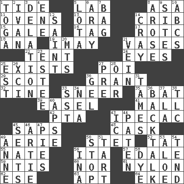 ACROSS 1. Event that recurs at intervals 5. Experiment locale 8. White ___ sheet 11. Baking chambers 13. Mouth or opening 14. Baby bed with high sides 15. An organ shaped like a helmet 16. Label 17. College mil. group 18. Santa ___, CA 19. "If ____ say so..." 21. Flower holders 22. Portable shelter 24. Sight organs 25. Is 27. Luau course 29. Highlander 30. Let have 32. Prong on a fork 33. Contemptuous expression 35. Blind as ____ 39. Artist's stand 41. Shopping center 42. Parent Teacher Assoc. 43. Medicinal drug used to evoke vomiting 45. Plant excrements 48. Keg 49. Nest on high 50. Proofreading order 52. Make lace 55. Nathan's nickname 56. Call ___ day 57. Peak District village in England 59. Nuclear Threat Initiatives 60. And not 61. High-strength synthetic material 62. Compass dir. 63. Fitting 64. Made supply last DOWN 1. Ancient Roman robe 2. _ the terrible 3. Accusation by an informer 4. Compass dir. 5. Globular water bottle used in Asia 6. Like ___ of sunshine 7. Paper or plastic container 8. Came up 9. Locates 10. Lettered men learn these first 12. Inhabitant of Heaven 14. Supercomputer manufacturer 20. Mountains (abbr.) 21. Distinctive style or manner 23. First name in cosmetics 25. Eastern Standard Time (abbr.) 26. One more than ninety 27. Before (prefix) 28. Boat paddle 30. Set 31. Corrects by punishment or discipline 33. Fast jet (abbr.) 34. Teachers' org. 36. Sass 37. Insect wing 38. Affectionate concern, for short 40. Domed church section 43. Frozen water 44. Eucharist need 45. Theater features 46. Nick name for Arthur 47. Sliced desserts 49. Queen of England 1702-14 50. Halt 51. Small pie 53. Medicinal plant 54. Look after 56. _ tizzy (2 wds.) 58. Color