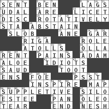 ACROSS 1. Posted 5. Benjamin's nick name 8. Falls behind 12. Freehold land 13. "We ___ not amused" (Victoria) 14. It is permitted: Lat. 15. Plate 16. Producing rotation 19. R.R. building 20. Choose not to consume 21. Messy guy 23. One (Scot) 24. Slender fish 27. Capital of Latvia 30. Hero or heavy, e.g. 31. Ringlike coral islands and reefs 34. Spanish pot 35. Monthly bill 38. Aches 40. First man 41. Medicinal plant 42. Foolish or stupid persons 44. Saudi Arabian king (1953-1964) 45. A blast of a horn 46. Followers of ems 47. Enemy 50. Inconspicuous attention getter 53. Heighten or intensify 57. Atlas unit 59. Supplying deficiencies 63. Grain storage tower 64. First name in cosmetics 65. Baking dish 66. Margarine 67. Pull into pieces 68. Conclude 69. Soft DOWN 1. Beer foam 2. Prepares for publication 3. Rhinal 4. Affectionate concern, for short 5. Sharp remark 6. Greek god of love 7. Remaining after all deductions 8. 54 in ancient Rome 9. Adept person 10. Set 11. Filthy place 14. Actor's bit 17. American Automobile Association (abbr.) 18. Metal container 20. "This won't hurt ____!" 22. Declaimed 24. Precious metal 25. Silent film actress Nazimova 26. 480, 500 or 516 sheets of paper 28. Republican Party 29. Mountain range southwest of Kyrgyzstan 30. Ridicules or criticizes harshly 32. Flaplike covering 33. In a ____ (agitated or irritated) 35. To erase 36. Liveliness 37. Horse sense 39. "Barney Miller" actor Jack 43. Drink excessively 47. Do some clerical work 48. Single 49. Eastern Standard Time (abbr.) 51. Grin 52. Lies 54. Corncob 55. "Terrible" tsar 56. Tear apart 58. "Silly old bear" 59. Put into a specified state 60. Purpose 61. Parent Teacher Assoc. 62. For each 63. Boy, to dad