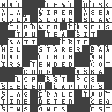 ACROSS 1. Floor protector 4. For fear that 8. Plate 12. According to 13. One who wires 14. At sea 15. Root beer relative 17. Biscuitlike quick bread 18. Cole _ (cabbage dish) 19. Turned at an angle; bent 21. Artist's stands 23. The 19th letter of the Greek alphabet 24. Afternoon social gathering 26. Be seated 27. Suttee (variant) 28. 4th largest of the Great Lakes 30. Cartoonist voice _ Blanc 31. A viewer who gazes fixedly 34. Sound made by sheep 37. Actress Charlotte 38. Soviet premier 1918-24 39. Black tropical American cuckoo 40. Big collection agency 41. Watched over 42. Small bed 43. Texas town _ City 44. "____ silly question..." 46. Trim (branches) 47. Fast jet (abbr.) 50. Personal Computers (abbr.) 51. Sowing specialist 54. Portable computers 57. Volcanic refuse 58. Peak District village in England 60. Strained 62. Hoop that covers a wheel 63. Prevent from occurring 64. Corporate head (abbr.) 65. Elected reps. 66. Washington bills 67. Eastern Standard Time (abbr.) DOWN 1. Big _ 2. _ vera 3. Baron Munchausen's specialties 4. It is permitted: Lat. 5. Eat (away) 6. Elected rep. 7. Relationship diagram 8. Hyrax 9. Small island 10. Lick closed 11. Crow sounds 13. Compass dir. 16. Blind as ____ 20. Fr. "Yes" 22. SW Saudi Arabia district 25. Nest on high 27. Singe 29. Tear apart 30. Medical imaging device (abbr.) 31. Downhill vehicle 32. Looks after 33. Plus 34. Keyboard key 35. Small Philippine buffalo 36. Small island 41. Drink excessively 43. Evades 44. Fitting 45. Native of Scotland 46. Memorize 48. Schedule 49. Lies 51. Fast planes 52. Writer Wiesel 53. Do over again 55. For each 56. Takes to court 59. Lair 61. Small child
