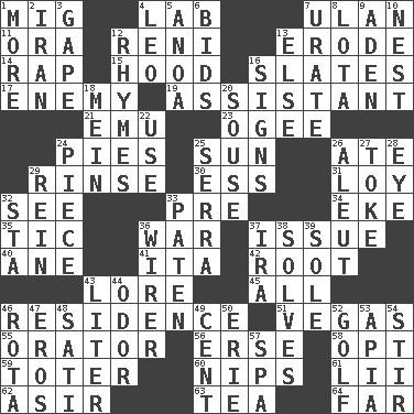 ACROSS 1. Russian fighter aircraft 4. Experiment locale 7. ____ Bator 11. Mouth or opening 12. Painter Guido (1575-1642) 13. Wear away 14. Reproach for some lapse or misdeed 15. Parka part 16. Chalkboards 17. Foe 19. Aide 21. Australian flightless bird 23. Double curve, resembling the letter S 24. Sliced desserts 25. Player for Phoenix 26. Had dinner 29. Wash lightly 30. Curvy letter 31. Myrna of the movies 32. Observe 33. Before (prefix) 34. Make supply last 35. Nervous spasm 36. Armed conflict 37. Come out of 40. A saturated hydrocarbon 41. Call ___ day 42. Carrot, for example 43. Old wives' tales, e.g. 45. Everything 46. Dwelling 51. Viva Las _ 55. Speaker 56. Celtic language 58. Elect 59. Carrier 60. Cuts off 61. Cards in a Roman deck? 62. SW Saudi Arabia district 63. Afternoon social gathering 64. Distant DOWN 1. Greater amount 2. SW Asia republic 3. Stare wonderingly 4. Lion 5. Small Philippine buffalo 6. Auction offers 7. A salt of uric acid 8. Globular water bottle used in Asia 9. Arabian gulf 10. A home for chicks 12. Poems 13. Otherwise 16. Attaches a signature 18. Count _ (2 wds.) 20. Lush 22. Purpose 24. Component 25. Spanish missionary in California 26. Native American of Southwest Alaska 27. Puff or smoke 28. Sight organ 29. It's straight from the horse's mouth 32. R.R. building 33. Eucharist need 36. One who wires 37. Lyricist Gershwin 38. Finds the solution 39. Flatfish 43. 61 cubic inches 44. Aroma 46. Round or rotation of duties 47. Greek god of love 48. Suttee (variant) 49. Penny 50. One of the Great Lakes 52. _ course 53. Capital of Western Samoa 54. Use a spoon 57. Health resort