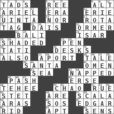 ACROSS 1. Small boys 5. To riddle 8. Keyboard modifier key 11. Satellite of Uranus 13. Epoch 14. One of the Great Lakes 15. National forest in Provo, Utah 16. And not 17. Round or rotation of duties 18. Label 19. Raised platform 21. Abalone 22. Indonesian resort city 24. Austrian river, tributary to the Danube 25. Cast a shadow over 27. Animal enclosure 29. Jacques of French films 30. Writing tables 32. In addition 33. To the left, to Queeg 35. Falsehood 39. Before Barbara or Clara 41. Sign of things to come 42. Ocean 43. Slept 45. Romantic infatuation 48. Celtic language 49. Giggle 50. US Secretary of Labor Elaine L. _ 52. Regret 55. Proofreading order 56. "We ___ not amused" (Victoria) 57. Any of the three canals of the cochlea 59. Ancient river in northeast Turkey 60. Mayday 61. _ Allan Poe 62. To free from 63. Fitting 64. Elected reps. DOWN 1. Tense 2. Roberta Peters solo 3. Empty-headed or silly people 4. Put into a specified state 5. Painter Guido (1575-1642) 6. Greek god of love 7. Ewer handle 8. Odor 9. 61 cubic inches 10. Separate forcefully 12. Dipping utensil 14. Blunders 20. Assist 21. Pig sound 23. Goodbye (Sp.) 25. R.R. building 26. Actor Linden 27. For each 28. Eastern Standard Time (abbr.) 30. ___ good deed 31. Discontinues 33. A saturated hydrocarbon 34. Parent Teacher Assoc. 36. Electrical Measurement 37. Area sheltered from the wind 38. Conclusion 40. American tennis player Robert 43. Teachers' org. 44. Came up 45. _ dish (used to culture cells) 46. Having the leading position 47. Arranges properly for use 49. Russian ruler of old 50. Riding implement 51. Command 53. ____ Bator, Mongolia 54. Hearing organs 56. White ___ sheet 58. Music discs