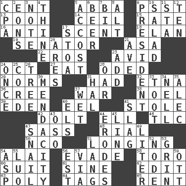 ACROSS 1. Penny 5. Swedish rock group 9. Inconspicuous attention getter 13. "Silly old bear" 14. To provide with a ceiling 15. Pace 16. Opposed to 17. Odor 18. Liveliness 19. Legislator 21. White ___ sheet 22. Greek god of love 23. Enthusiastic 24. Sep. follower 27. Consume 28. Wrote a lyric poem 29. Typical standards 31. Possessed 32. Inactive volcano in Sicily 36. Algonquian 37. Armed conflict 38. Christmas carol 39. Locale of original sin 40. Snakelike fish 41. Took without asking 42. Dunce 44. Pipe bend 46. Affectionate concern, for short 47. Backtalk 48. Monetary unit of Yemen 50. Non-commissioned officer (abbr.) 51. Yearning 54. Jai _ 56. Elude 58. "Corrida" creature 60. Costume for a special activity 61. Trig term 62. Prepare for publication 63. Much (prefix) 64. Labels 65. Monthly bill DOWN 1. Accounting whiz (abbr.) 2. Immeasurably long periods of time 3. Musical sound 4. One or ones belonging to thee 5. Buttonhole 6. Fermented drink made from hops 7. Storage container 8. Keyboard modifier key 9. Elected leader of a country 10. First course 11. R.R. building 12. "___ Little Indians" 17. Portico 20. Ancient Greek god of war 21. "___ Maria" 23. Find the sum of 24. At one time in the past 25. Drawstring 26. Woody plant 28. Boat paddle 30. Ananias' fault 31. Actor Linden 33. A blast of a horn 34. 1994 drama film starring Jodie Foster 35. Actor Baldwin 37. Soggy 40. Raised railways 41. Volcanic refuse 43. Bear (Spanish) 44. Eats (away) 45. Actor's bit 47. Slow-paced one 49. 61 cubic inches 51. Austrian-born American filmmaker Fritz 52. Thickened enlargement 53. Broad smile 54. Cleo's killer 55. Nilotic language 56. Eastern Standard Time (abbr.) 57. By way of 59. Baseball player Mel
