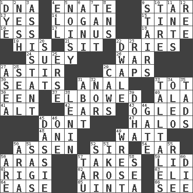 ACROSS 1. Heredity factor (abbr.) 4. Related on the mother's side 9. Play the lead 13. It is so 14. Utah city north of Ogden 15. Prong on a fork 16. Double-curved letter 17. "_ and Lucy" (Charlie Brown theme song) 18. Johnson of "Laugh-In" 19. Part of HMS, perhaps 21. Be seated 22. Frees from moisture 24. Chop _ 26. Armed conflict 27. Being in motion 29. Balmoral and tarboosh 30. Theater features 31. Of or related to the anus 33. Small child 36. Car or cant ending 37. Turned at an angle; bent 40. In the manner of 41. The first octave above the treble staff 42. Hearing organs 43. Stared 45. Do not 47. Rings 48. Black tropical American cuckoo 49. Electrical Unit 50. NE Netherlands city 52. Title for a knight 54. Ewer handle 56. Caspian sea tributary 57. Proceeds 59. Flaplike covering 61. Swiss mountan, "Queen of the Mountains" 62. Came up 63. Biblical high priest 64. Relaxation 65. National forest in Provo, Utah 66. Perceive with the eye DOWN 1. Color 2. Soft 3. Helper 4. Pipe bend 5. Annoyingly loud 6. Hindu god of fire 7. Drawn tight 8. Followers of ems 9. Flight of steps 10. Become fatigued 11. Pismires 12. Portuguese money of account (variant) 20. Costume for a special activity 22. A sleeping potion; an opiate (poet.) 23. Reproach for some lapse or misdeed 25. Celtic language 27. Toward the sea 28. Sew up the eyelids of hawks and falcons 29. Crow sounds 31. Blind as ____ 32. And not 33. Baron Munchausen's specialties 34. Butter sub 35. Small boys 38. Soviet premier 1918-24 39. Capital of the state of Qatar 44. Yard entry 45. Hyrax 46. Single 49. Obtain by seizing forcibly or violently 50. Operatic vocal solo 51. Droops 52. Indian skirt 53. Picture 55. Cause heat under the collar 56. "We ___ not amused" (Victoria) 57. The 19th letter of the Greek alphabet 58. Ocean 60. Expire