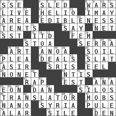 ACROSS 1. Compass dir. 4. Downhill vehicle 8. Armed conflicts 12. Moving, as bait 14. Sun: prefix 16. "If ____ say so..." 17. Length times width 18. The property of being fit to eat 20. Portable shelters 22. Declare 23. Fish or hair follower 24. Fast jet (abbr.) 25. It would 28. Opposite of masc. 30. Portico 31. Spanish missionary in California 35. Tate display 37. Small Philippine buffalo 40. The visible part of the earth's surface 41. Entreaty 42. Allots cards 44. Narrow board 45. SW Saudi Arabia district 46. Indian titles of respect 47. Snakelike fish 48. Music written for nine 50. Nuclear Threat Initiatives 52. Hit sharply and swiftly 54. Eastern Standard Time (abbr.) 55. Santa ___, CA 58. Age 61. Daniel's nick name 63. Grain storage towers 65. Interpreter 70. Crowds into 71. Billionth: prefix 72. Damascus' land 73. Whimper 74. Having or resembling wings 75. Drop; flow; fall 76. Lair DOWN 1. Narrow boards 2. Fathers 3. Happening 4. A female animal or person 5. Directed 6. Connecticut Ivy Leaguer 7. Rights 8. Victory 9. So be it 10. Raze (variant) 11. System (abbr.) 13. Ingest 15. Norwegian king 19. Snake ____ (dice throw) 21. Be seated 26. Frog relative 27. Natives or inhabitants of Denmark 29. Makes clutter 30. A viewer who gazes fixedly 32. Hero or heavy, e.g. 33. Monetary unit of Yemen 34. Keyboard modifier key 35. In addition 36. It's straight from the horse's mouth 38. Boat paddle 39. Place in a line 41. Baking dish 43. Fast planes 49. Small amounts or degrees 51. ___ a Wonderful Life 53. Friends 55. Verbally 56. Impressive in appearance 57. NE Netherlands city 58. Inactive volcano in Sicily 59. Taken by mouth 60. Nanny 62. Negative votes 64. Mischievous child 66. Or not 67. Three (prefix) 68. Petroleum 69. Actress Charlotte