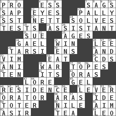 ACROSS 1. Adept person 4. Double-curved letter 7. Sinks 11. Plant excrement 12. Snake ____ (dice throw) 13. Chummy 14. Fast jet (abbr.) 15. Remaining after all deductions 16. Finds the solution 17. Trials 19. Aide 21. Institute legal proceedings 23. Eras 24. Highlander 25. Acquire through effort 26. Area sheltered from the wind 29. Tarsus (plural) 30. Followers of ems 31. Added to 32. Zeal 33. Consume 34. Music discs 35. Cuckoo 36. Armed conflict 37. Drinks excessively 40. Nine, plus one 41. ___ a Wonderful Life 42. Mouths or openings 43. Old wives' tales, e.g. 45. Set 46. Dwelling 51. Prying instrument 55. Speaker 56. Caspian sea tributary 58. Binary compound 59. Carrier 60. Mediterranean tributary 61. Direct toward a target or goal 62. SW Saudi Arabia district 63. Afternoon social gathering 64. Lion DOWN 1. Inconspicuous attention getter 2. To erase 3. Elects 4. Sight organ 5. Bristle 6. Fast planes 7. Table seasonings 8. Inventor's middle name 9. Small, secluded valley 10. System (abbr.) 12. Takes place subsequently 13. Airs 16. Attaches a signature 18. Russian ruler of old 20. Inhabitant of Heaven 22. Biblical high priest 24. Homeless child 25. Puts on (as clothing) 26. Shoestrings 27. Conclusions 28. Begley and Asner 29. Prong on a fork 32. Large container 33. Consumed 36. One who wires 37. Coat; cloak 38. Threatening words 39. Light colored 43. 61 cubic inches 44. Aroma 46. Roll call or roster of names 47. Greek god of love 48. Suttee (variant) 49. Patter 50. One of the Great Lakes 52. Small bottle 53. Singer Brickell 54. San ____ (Riviera town) 57. In the manner of