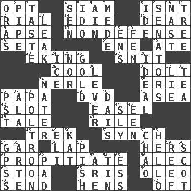 ACROSS 1. Choose 4. Thailand, formerly 8. Is not 12. Monetary unit of Yemen 14. Singer Brickell 15. Letter starter 16. Domed church section 17. Unrelated to defense, as in spending 20. Stalk of a moss capsule 21. Compass dir. 22. Had dinner 23. Supplementing with great effort 27. Stricken, poetically 29. Calm and collected 31. Stupid person 34. Haggard of country music 35. 4th largest of the Great Lakes 36. Dad 39. Movie disc 41. Toward the sea 42. Groove 43. Artist's stand 46. Lie 47. Cause heat under the collar 48. Long journey 51. Synchronize (abbr.) 54. Slender fish 56. Pet locale 58. Possessive pronoun 61. Appease 66. Actor Baldwin 67. Portico 68. Indian titles of respect 69. Butter sub 70. Transmit 71. Coop moms 72. Often (poetically) DOWN 1. Mouths or openings 2. Corncob 3. Clothes sense 4. Elected rep. 5. Wedding promise 6. The 18th letter of the Arabic alphabet 7. Ancient Persian 8. Binary compound 9. Legislators 10. Political cartoonist Thomas 11. Woody plant 13. Path through which fluid escapes 18. Followers of ems 19. Opposite of masc. 24. Frozen water 25. Not either 26. Gilt 28. Standard of perfection 30. Prying instrument 32. Falsehood 33. Afternoon social gathering 34. Mother 36. Pacific Standard Time (abbr.) 37. Insect wing 38. Coward 40. Raised platform 44. Roguish 45. Car or cant ending 49. Connecticut Ivy Leaguer 50. Krazy ___ of comics 52. US Secretary of Labor Elaine L. _ 53. Phone greeting 54. Global Positioning Systems (abbr.) 55. Johnson of "Laugh-In" 57. Expression of disdain 59. Coral collection 60. Highlander 62. Writing tablet 63. "We ___ not amused" (Victoria) 64. Shallow baking pan 65. Double-curved letter