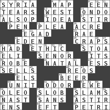 ACROSS 1. Damascus' land 6. Atlas unit 9. Car or cant ending 12. Separates forcefully 13. Compass direction 14. Southwest Nigerian state 15. Columnist Joseph or Stewart 16. It may be bright or harebrained 17. Tumult 18. Animal enclosure 19. Entreaty 20. 1/640 square mile 21. Mild oath 23. Actress Charlotte 24. Locale of original sin 25. Dice game 28. Possessed 30. Principle of right and wrong 34. Portico 35. Biblical high priest 36. Sir (Sp.) 38. It is 39. Loose flowing garment 41. Brizilian seaport 43. Double-curved letter 44. Exchanges for money 46. Vintage cars 48. Raised railways 49. Fermented drink made from hops 50. A single undivided whole 51. Scent 53. She-sheep 56. Margarine 57. Messy guy 58. Hits or strikes with great force 60. Political cartoonist Thomas 61. Without 62. Moving about 63. Followers of ems 64. Bank Draft (abbr.) 65. _ dish (used to culture cells) DOWN 1. R.R. building 2. Sharp bark 3. Raze (variant) 4. Pressed 5. Viper 6. Ancient Persian 7. Toward the sea 8. Parent Teacher Assoc. 9. Pleas 10. Singer Brickell 11. And not 13. Uncontrolled 14. Motion picture awards 19. Leg coverings 20. Curve 22. Unit of force equal to gravity 24. The property of being fit to eat 26. Plant holders 27. Backtalk 28. Possessive pronoun 29. _ vera 31. Layer 32. _ tizzy (2 wds.) 33. Small bed 37. Less widely known 40. American author Paul (1891-1958) 42. Area sheltered from the wind 45. Fast jet (abbr.) 47. Threatening words 49. Moves up and down 50. Uhlan (variant) 51. Norwegian king 52. Do not 54. Electrical Unit 55. Arab leader 56. Single 57. Compass dir. 58. Plant excrement 59. _ Lanka